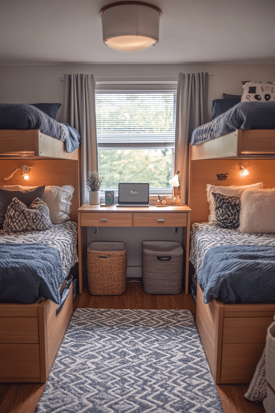 Shared dorm designs feel more cohesive with coordinated décor and layouts. Matching elements create visual harmony. These college dorm room ideas improve both style and functionality. Organized storage keeps everything neat. The space feels welcoming and balanced. Design together with more shared college dorm room ideas.