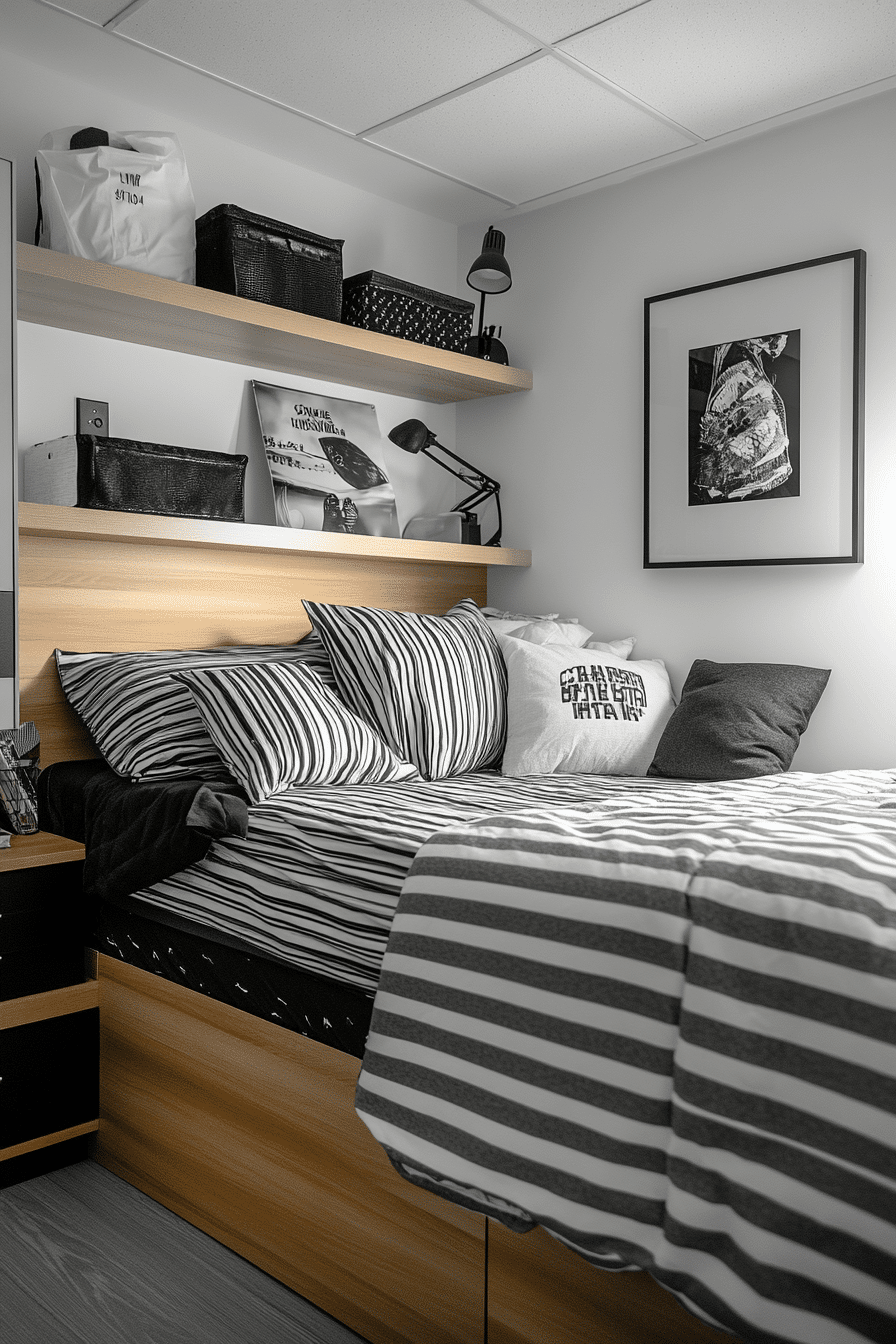 Black, white, and grey combinations give dorm rooms a clean and modern aesthetic. Strong contrast creates visual interest while maintaining simplicity. These college dorm room ideas are timeless and easy to update. Small accent pieces keep the design dynamic. The space feels polished and refined. Upgrade your style with more monochrome college dorm room ideas.