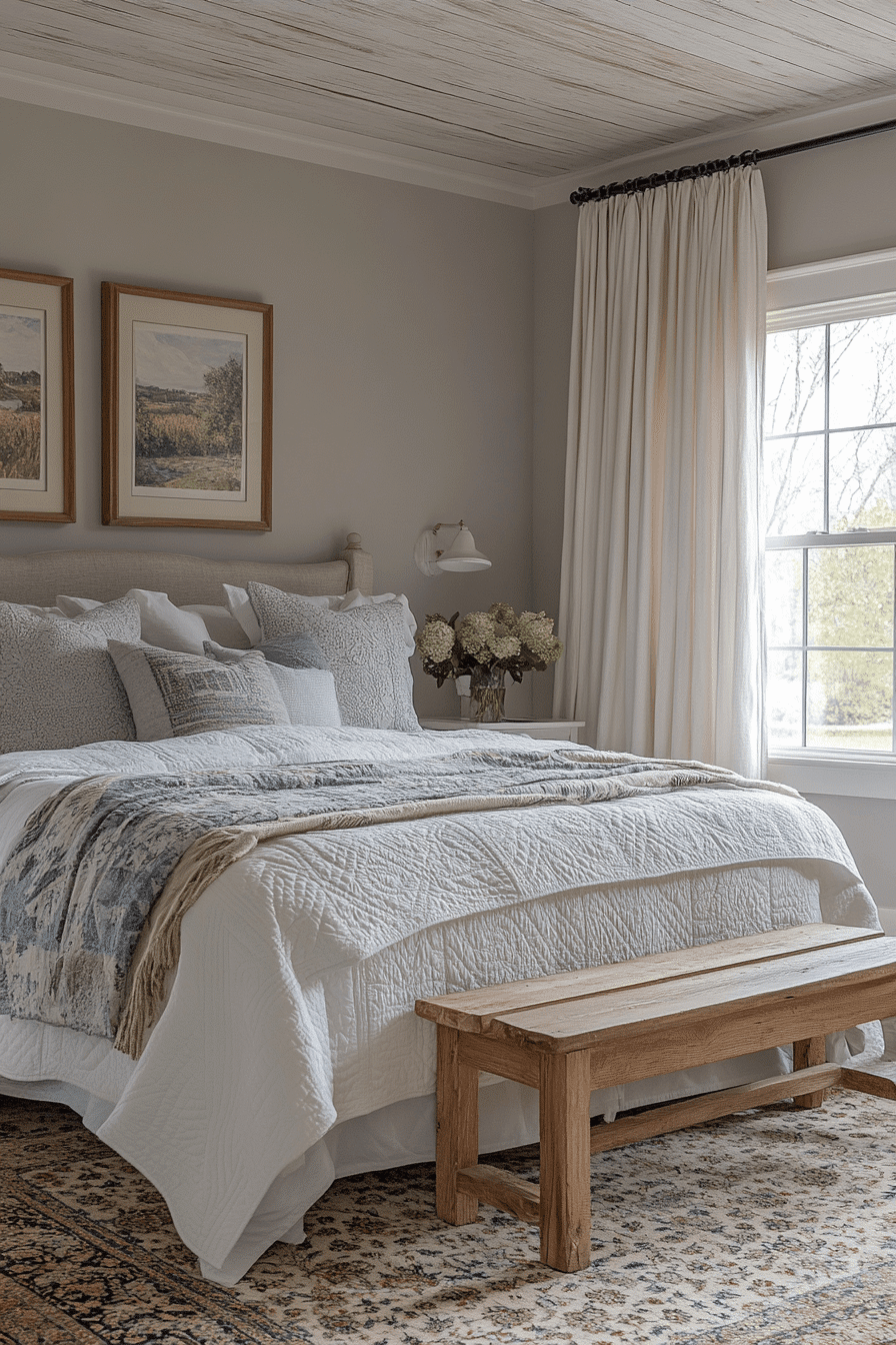 Layered quilts in soft tones bring warmth and comfort into the center of the space. This cottagecore bedroom highlights stacked bedding that feels inviting and cozy. Each layer adds texture without overwhelming the design. Surrounding elements enhance the restful mood. The space feels nurturing and soft. Discover more quilt-layered cottagecore bedroom inspiration today.
