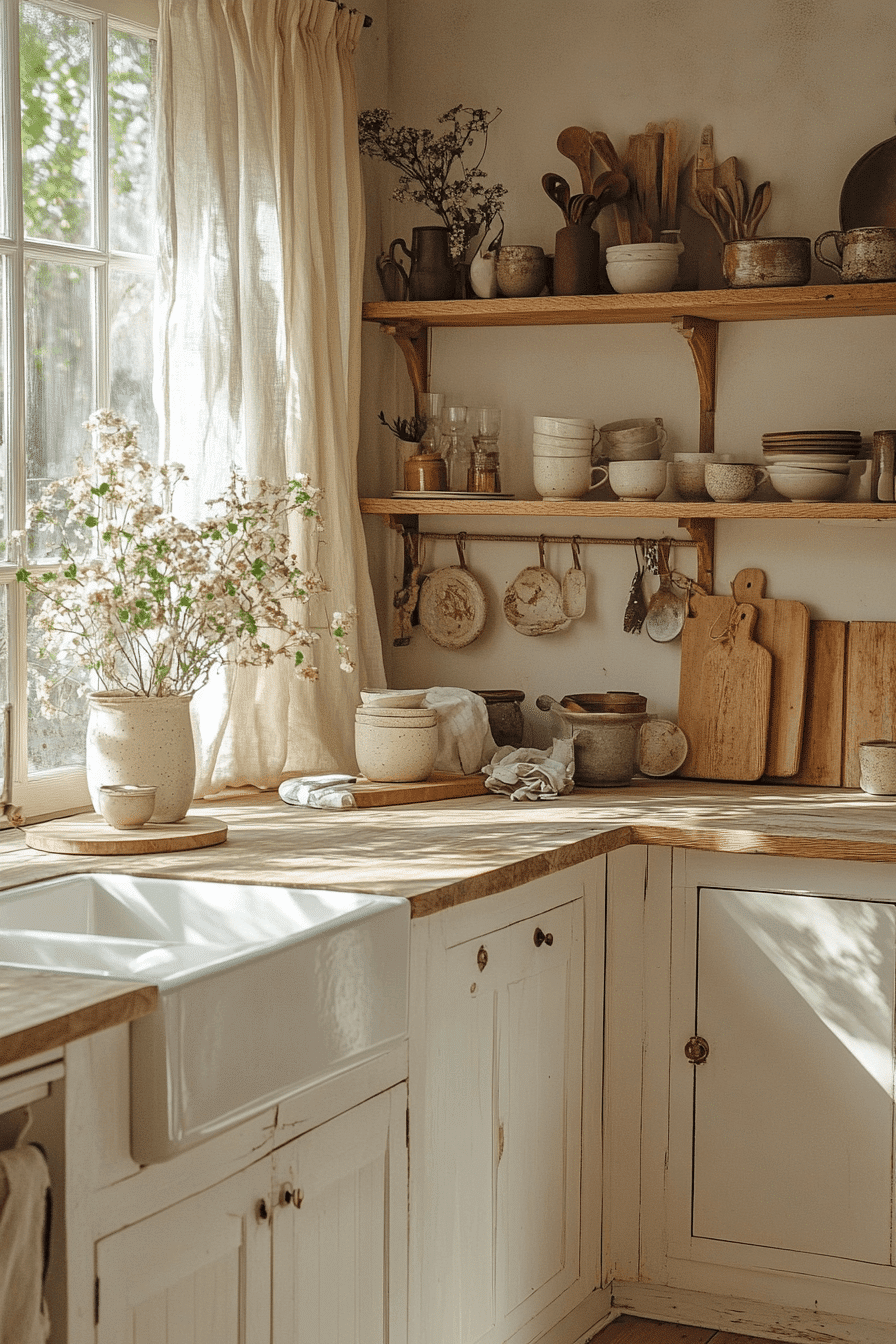 Soft cream tones wrap the space in warmth, giving it a cozy and timeless appeal that feels instantly comforting. This cottagecore kitchen highlights natural wood textures against a gentle palette. Linen curtains and handcrafted details add personality without excess. Open shelving and warm lighting create a lived-in feel. The balance between function and beauty feels effortless. Click to discover more cozy cream cottagecore kitchen inspiration.