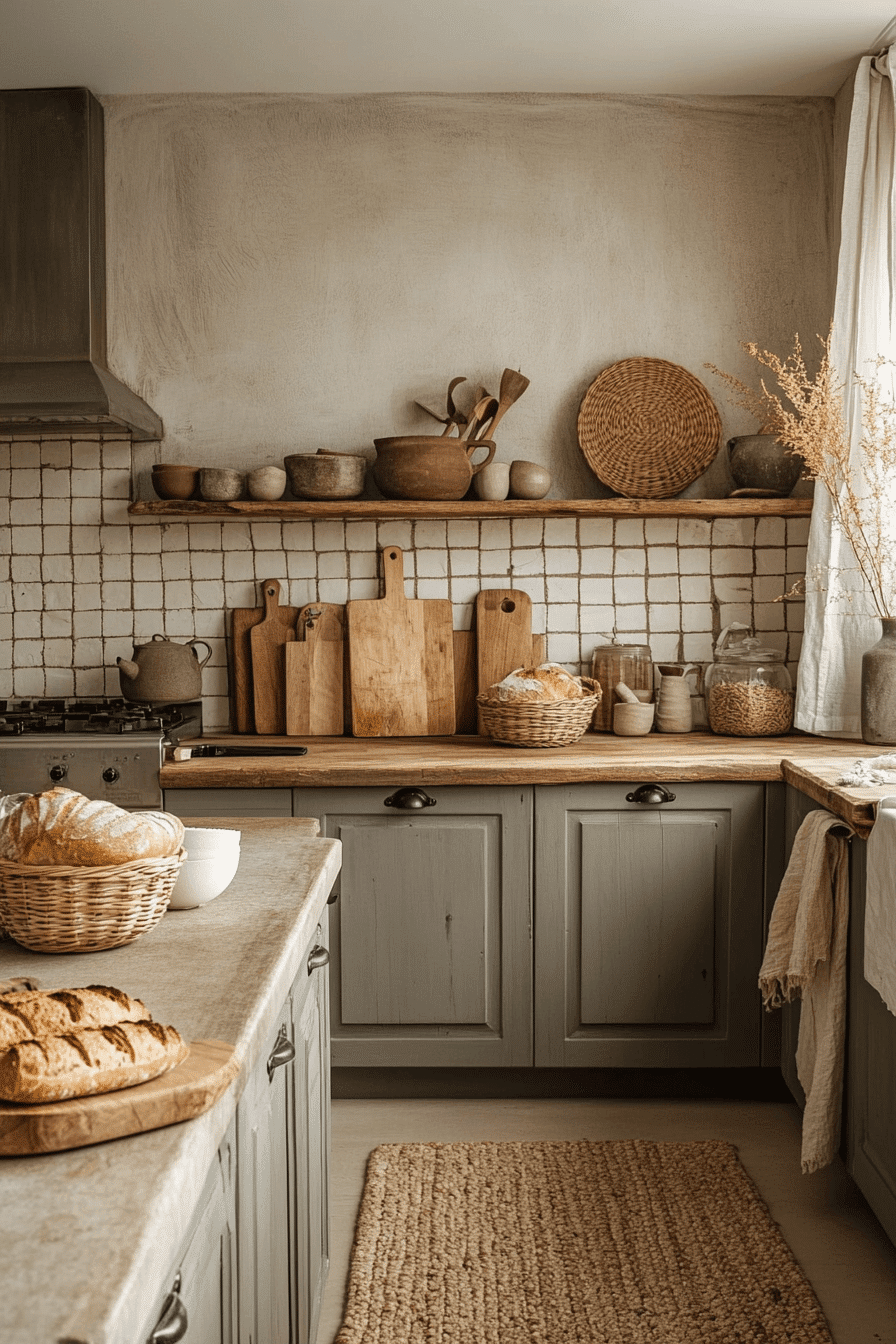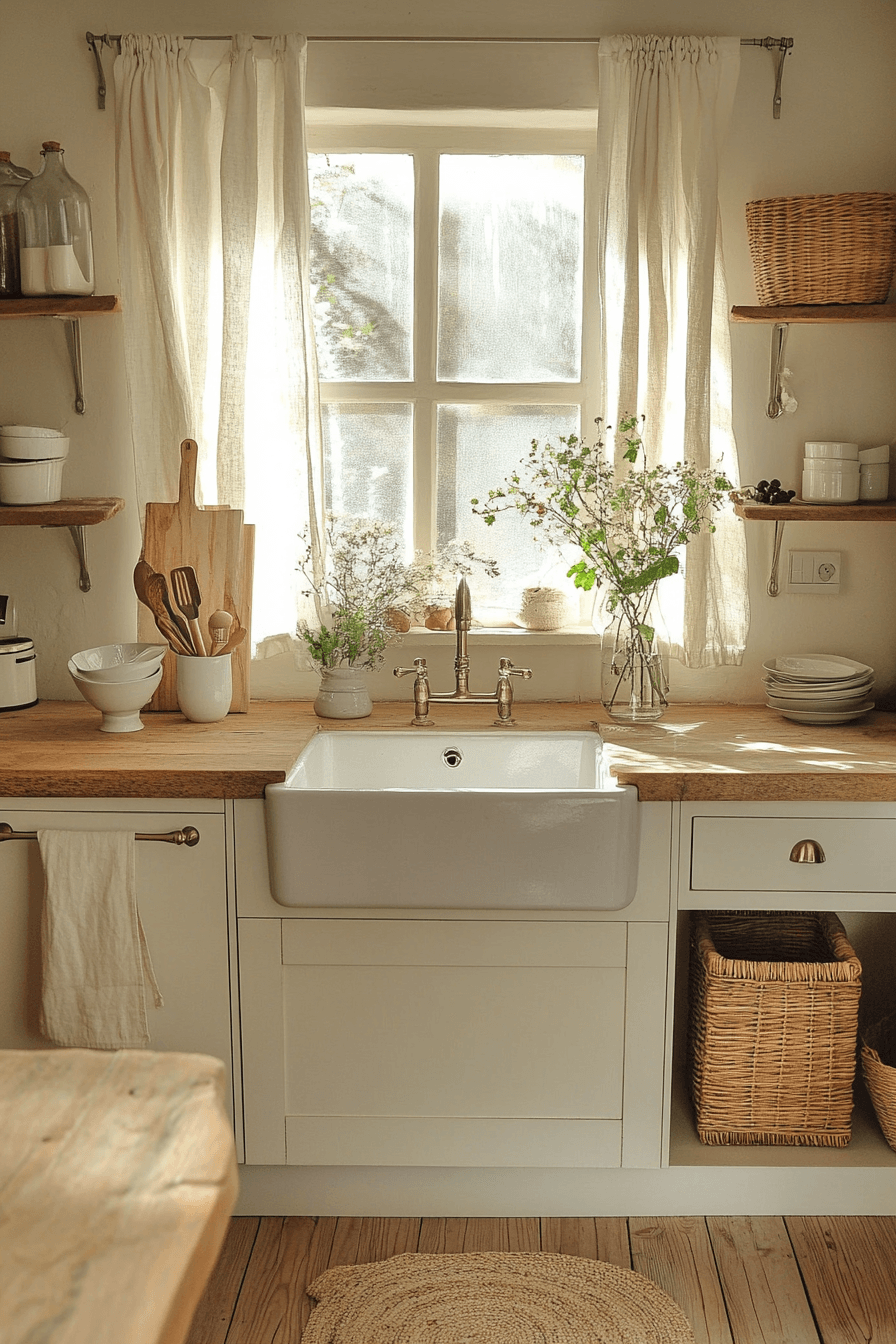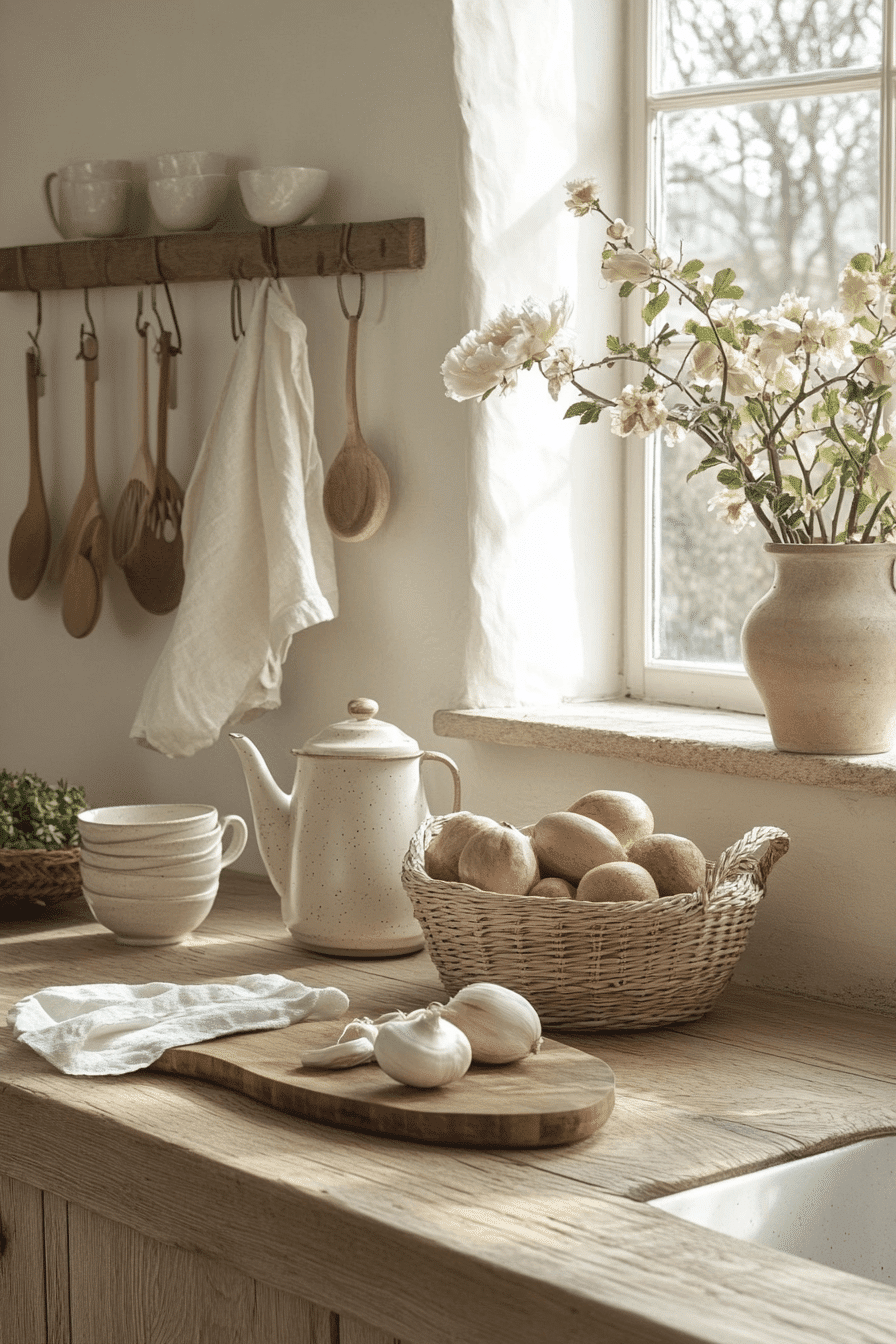 Neutral shades build a soft retreat that feels balanced and soothing throughout. This cottagecore kitchen blends creams, taupes, and pale grays for a calming palette. Wooden accents add natural warmth without overwhelming the design. Woven baskets and simple ceramics add charm and function. The space feels grounded and inviting. Tap to discover more neutral cottagecore kitchen ideas.