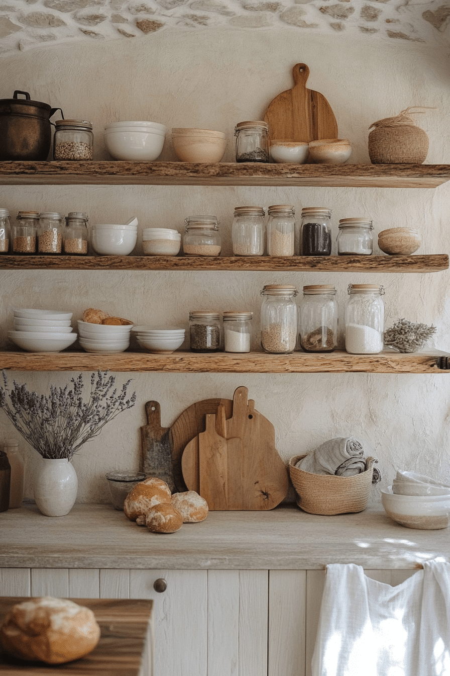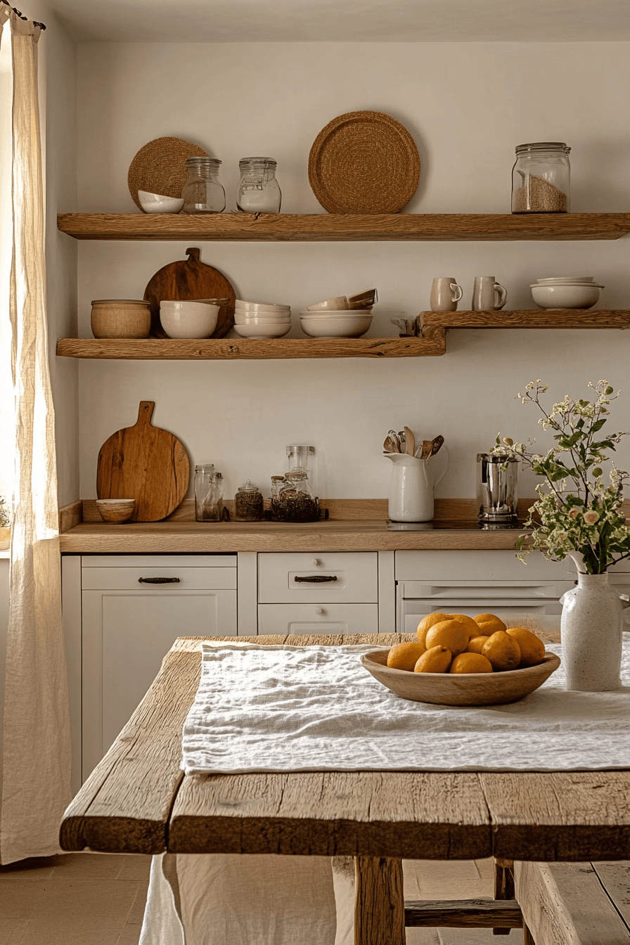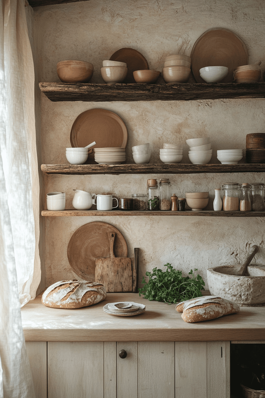 Neutral shades build a soft retreat that feels balanced and soothing throughout. This cottagecore kitchen blends creams, taupes, and pale grays for a calming palette. Wooden accents add natural warmth without overwhelming the design. Woven baskets and simple ceramics add charm and function. The space feels grounded and inviting. Tap to discover more neutral cottagecore kitchen ideas.