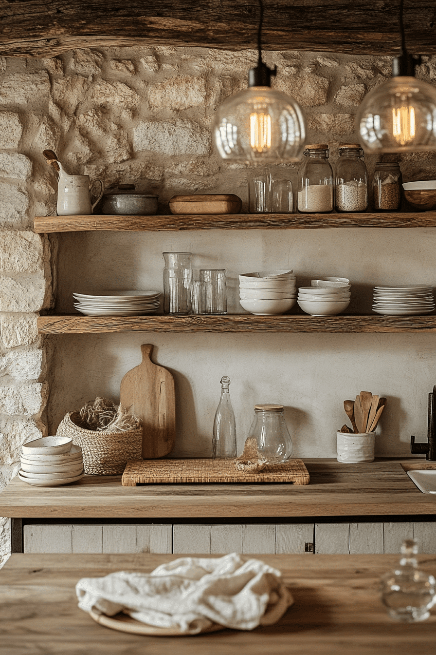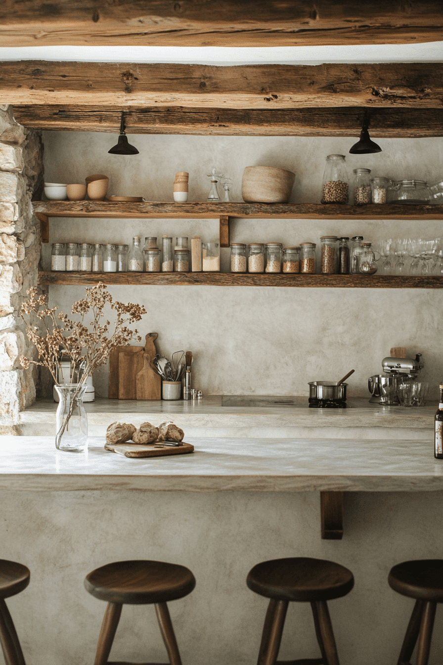 Minimal styling shows how simplicity can feel warm, clean, and welcoming. This cottagecore kitchen highlights natural materials and soft textures throughout. Neutral tones keep the design calm and uncluttered. Wooden seating adds comfort and warmth. The layout feels practical and inviting. Click to see more minimal cottagecore kitchen ideas.