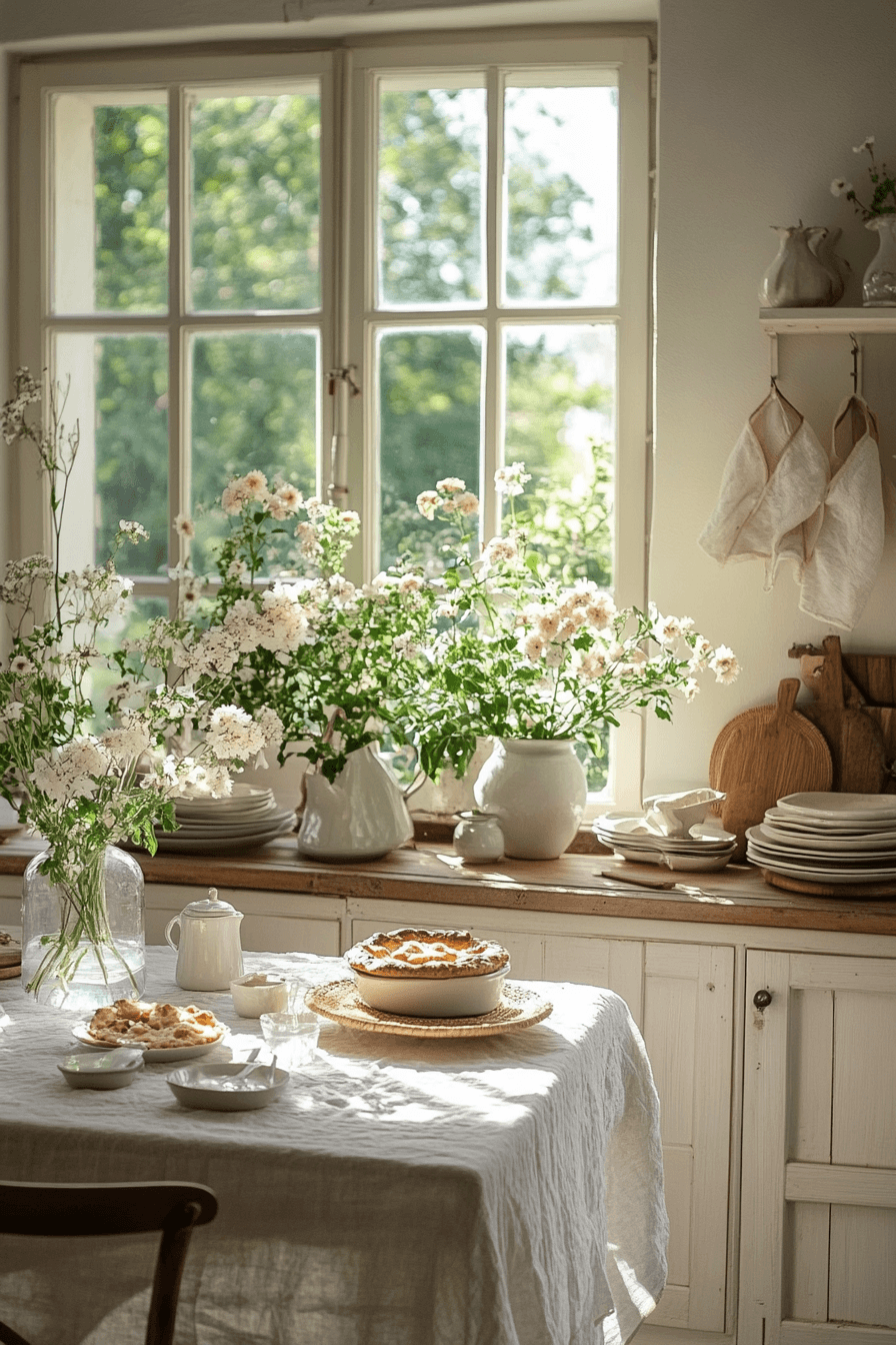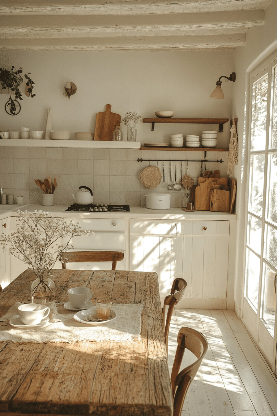 Soft tones and delicate textures create a light, cloudlike environment that feels peaceful and airy. This cottagecore kitchen uses pale hues to enhance openness. Natural light brightens every surface. Cozy accents add warmth without clutter. The space feels calm and inviting. Tap to explore more soft cottagecore kitchen inspiration.
