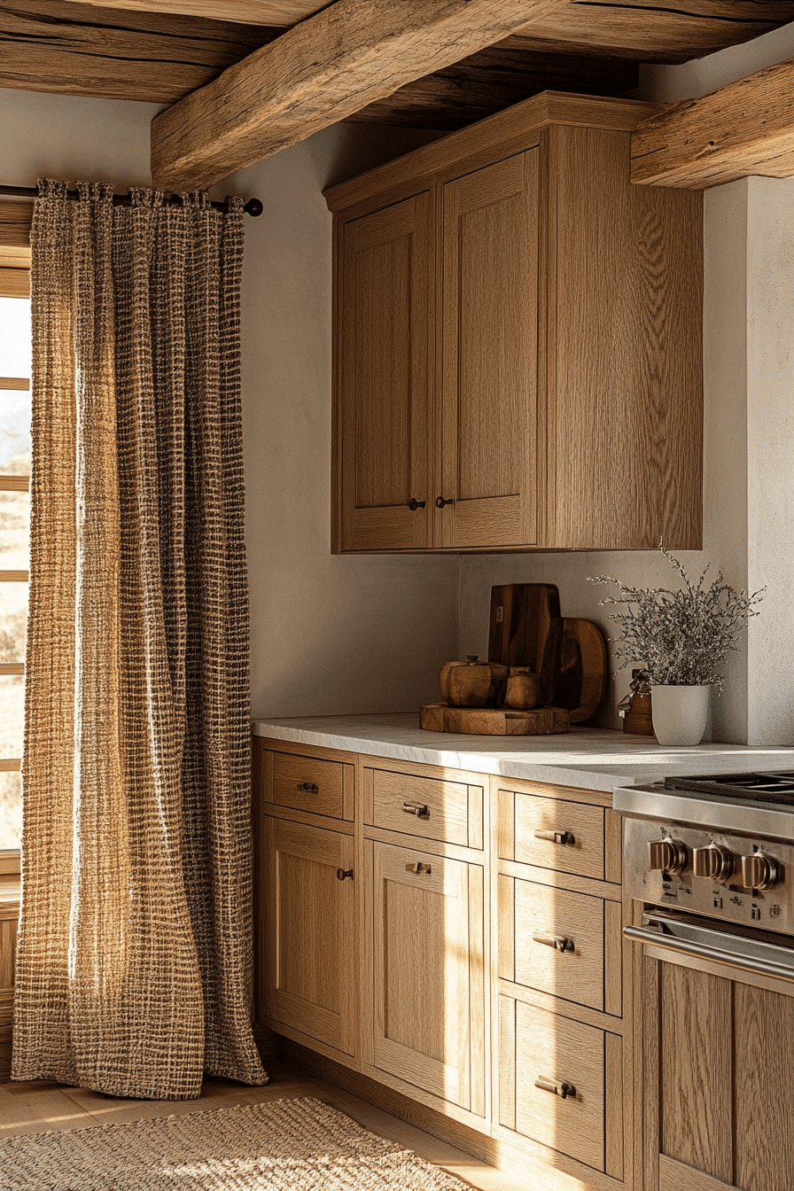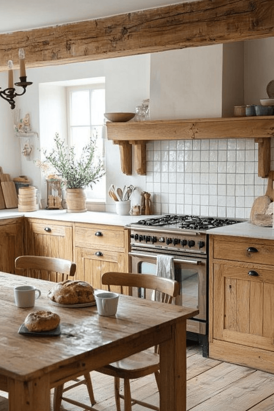 Exposed beams introduce natural structure and rustic character into the space. This cottagecore kitchen blends sturdy elements with soft fabrics for balance. The contrast adds depth without heaviness. A central table invites shared meals and connection. The space feels grounded and welcoming. Tap to discover more beam-inspired cottagecore kitchen ideas.