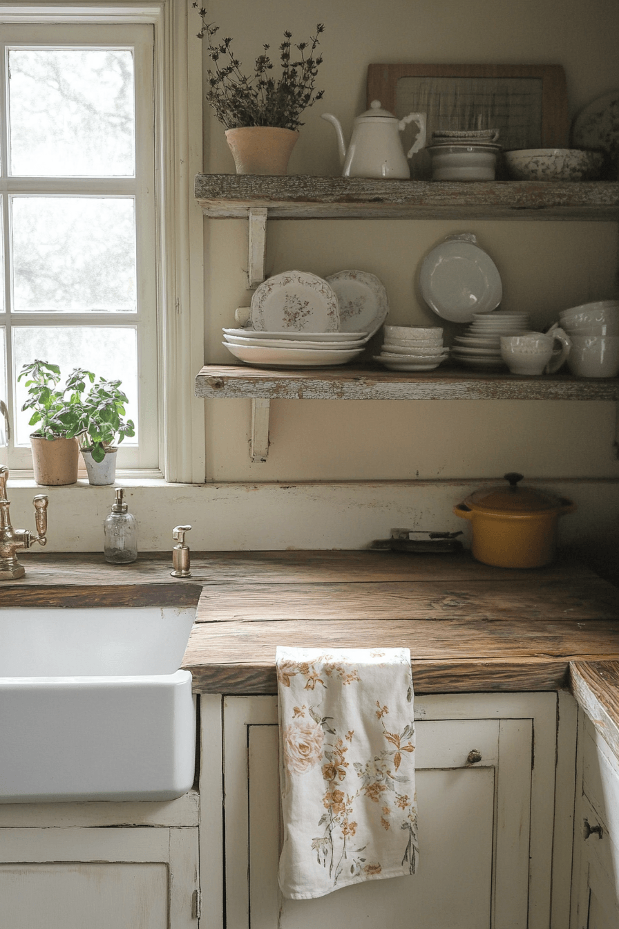 Timeworn finishes add authenticity and charm, creating a space that feels relaxed and beautiful. This cottagecore kitchen embraces aged textures and muted tones. Imperfections enhance the warmth. Soft fabrics balance the rustic elements. Every detail feels comforting. Click to explore more vintage cottagecore kitchen inspiration.
