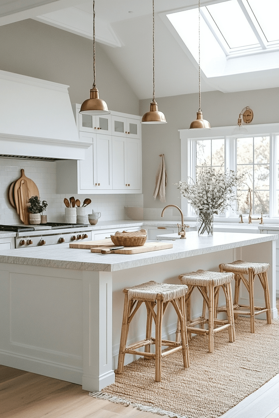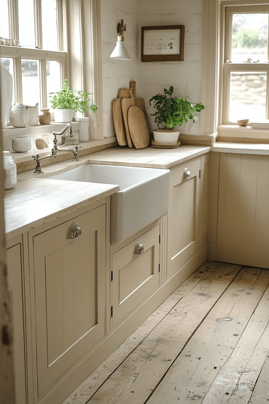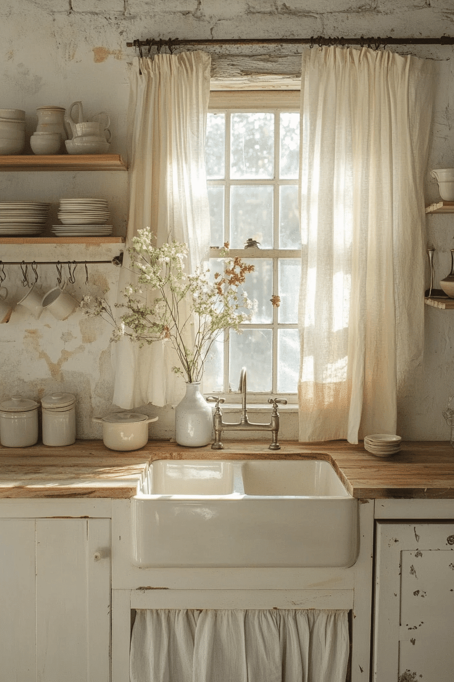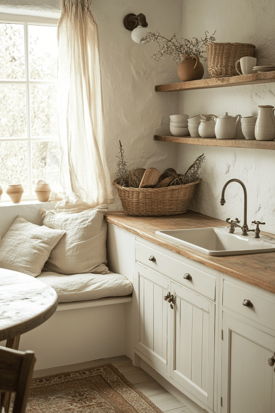 Lightwashed tones of white and sand create a bright and airy environment that feels fresh and calming. This cottagecore kitchen reflects sunlight beautifully across painted wood and stone surfaces. Minimal cabinetry keeps the space clean and intentional. Soft fabrics add subtle texture throughout. The atmosphere feels peaceful and relaxed. Click to explore more lightwashed cottagecore kitchen inspiration.