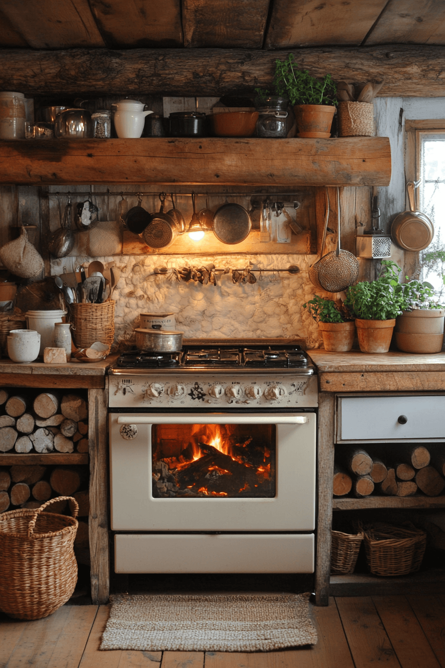 Hearth-inspired tones bring warmth and comfort into the center of the home. This cottagecore kitchen blends rustic wood with soft fabrics for a balanced look. The design encourages gathering and shared moments. Every detail feels thoughtful and warm. The atmosphere feels welcoming and calm. Click to discover more hearthside cottagecore kitchen inspiration.