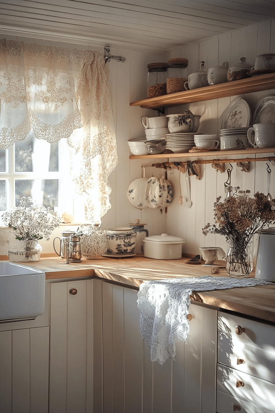 Delicate fabrics and soft textures bring a refined charm that feels timeless and inviting. This cottagecore kitchen uses linen and lace accents to enhance the design. Neutral tones keep everything light and cohesive. Wooden elements provide grounding warmth. Handmade details add gentle personality. Click to explore more linen-inspired cottagecore kitchen looks.