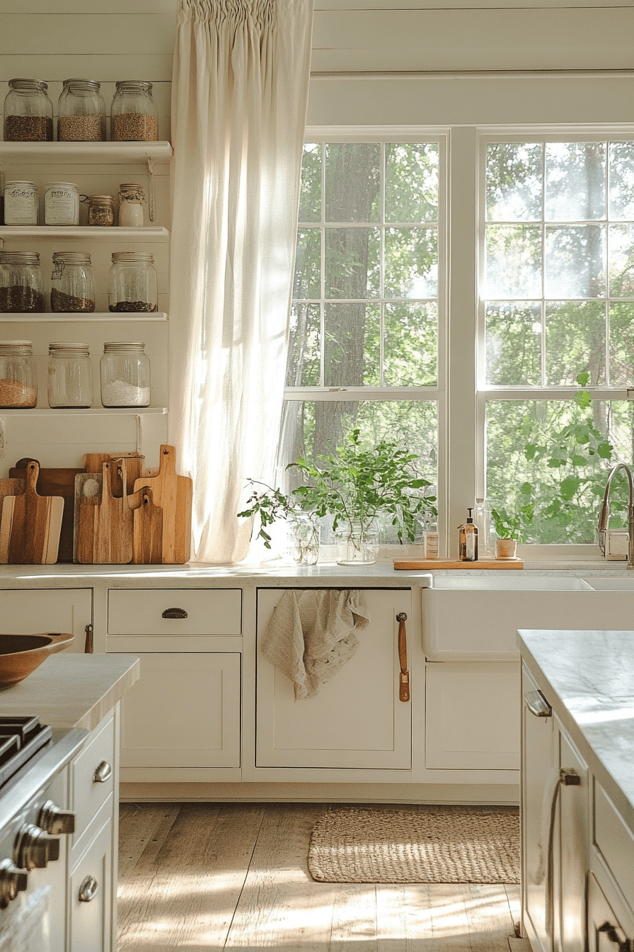 Soft whites and pale grays create a cloudlike atmosphere that feels calm and spacious. This cottagecore kitchen layers textures for depth while keeping the palette light. Wooden accents add warmth to balance the cool tones. The space feels peaceful and inviting. Every detail supports comfort and ease. Tap to explore more soft neutral cottagecore kitchen inspiration.