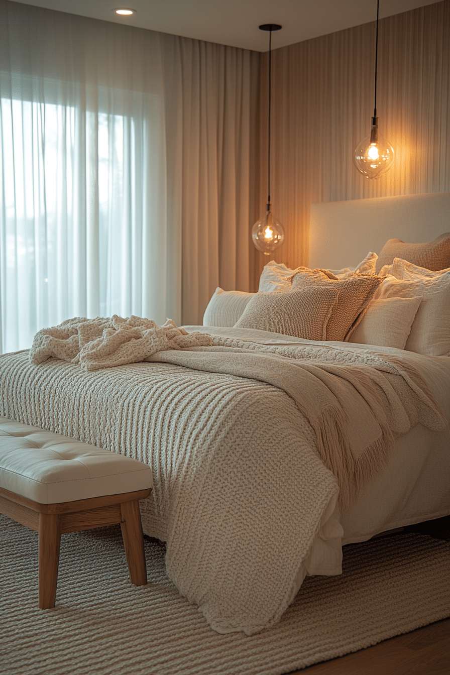 Creamy beiges and soft whites fill your cozy neutral bedroom with a cashmere-like warmth. Plush textures enhance the inviting atmosphere. Light bounces evenly across every surface, creating a soft, glowing radiance. The room feels curated yet deeply comfortable.