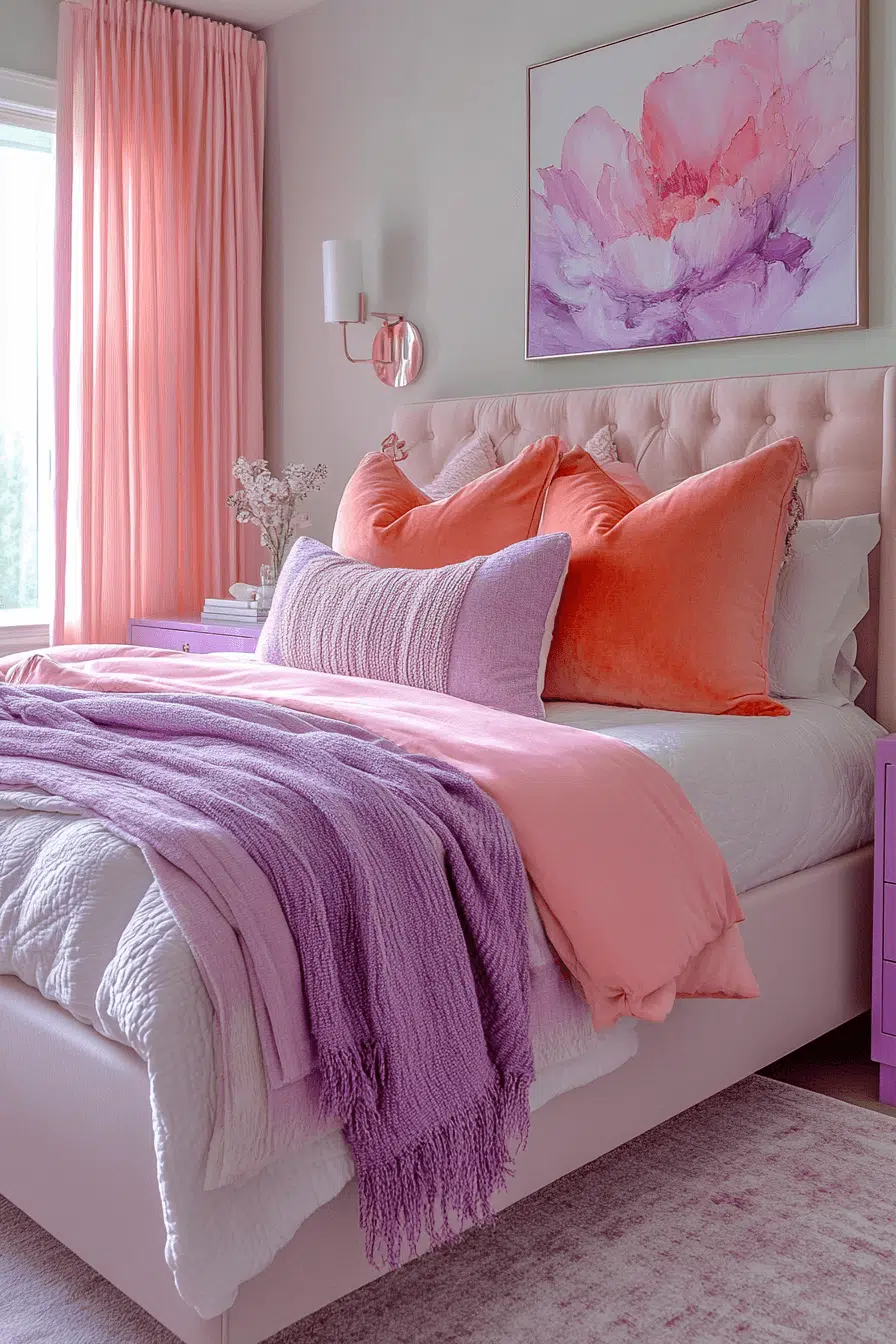 Peachy coral and soft rose hues bring warmth and motion to this dopamine decor bedroom. Sculptural bedside tables add artistic energy. Velvet accents introduce rich texture. The palette feels vibrant but elegant. It’s cozy with a confident twist. Introduce warmth through fearless color layering.