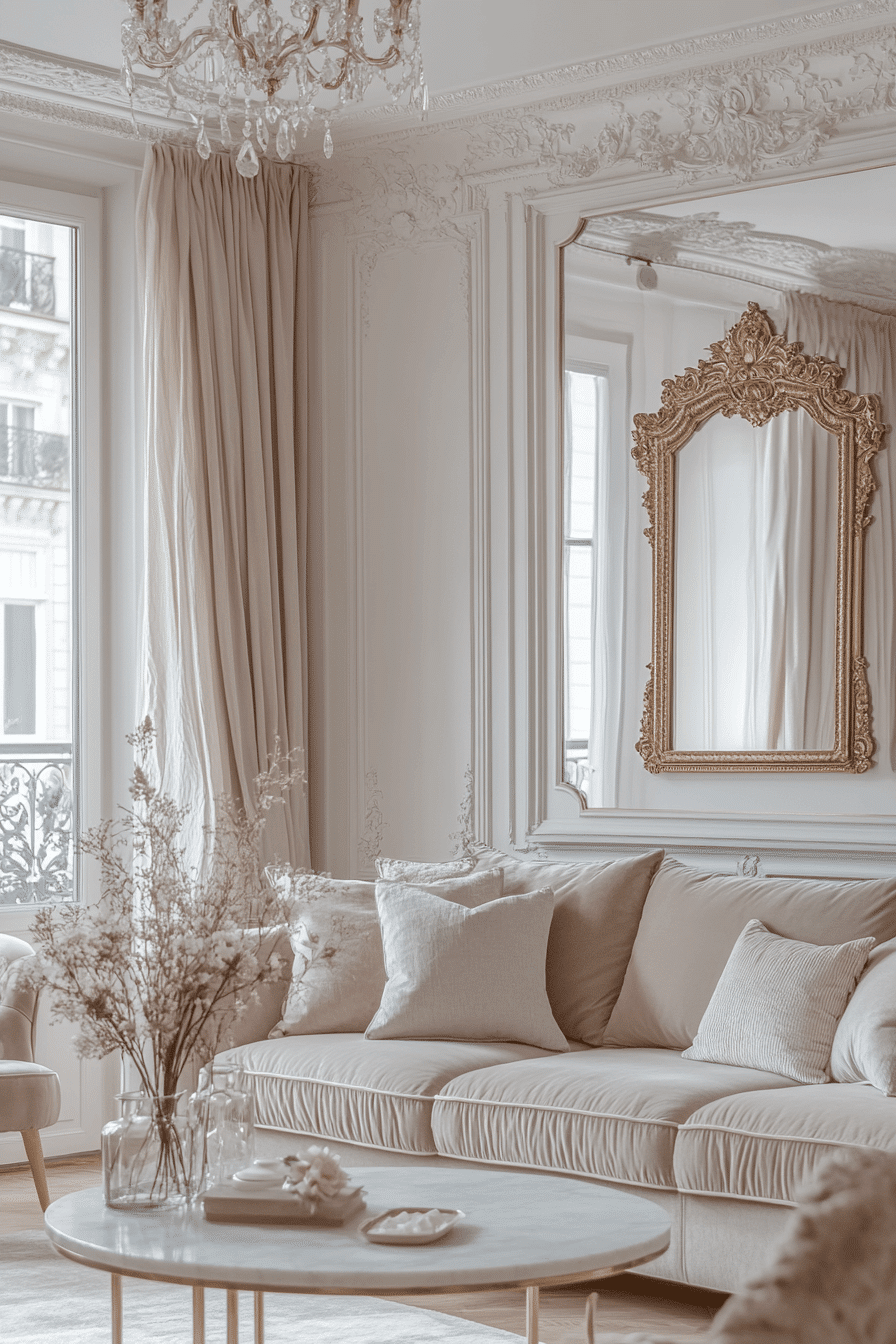 Romantic details and refined simplicity meet beautifully in dream apartment decor with Parisian influence. Ornate mirrors, soft lighting, and graceful textures create effortless sophistication. The blend of vintage elegance with contemporary comfort makes the space both charming and practical. Warm metallic accents and curated decor enhance the overall ambiance. This look creates an atmosphere that feels timeless and romantic.