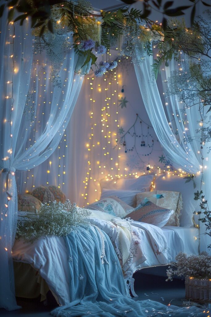 This bedroom features flowing, ethereal drapes and twinkling fairy lights, creating a magical ambiance that invites dreams. The soft lighting and gentle fabrics make it a soothing retreat.