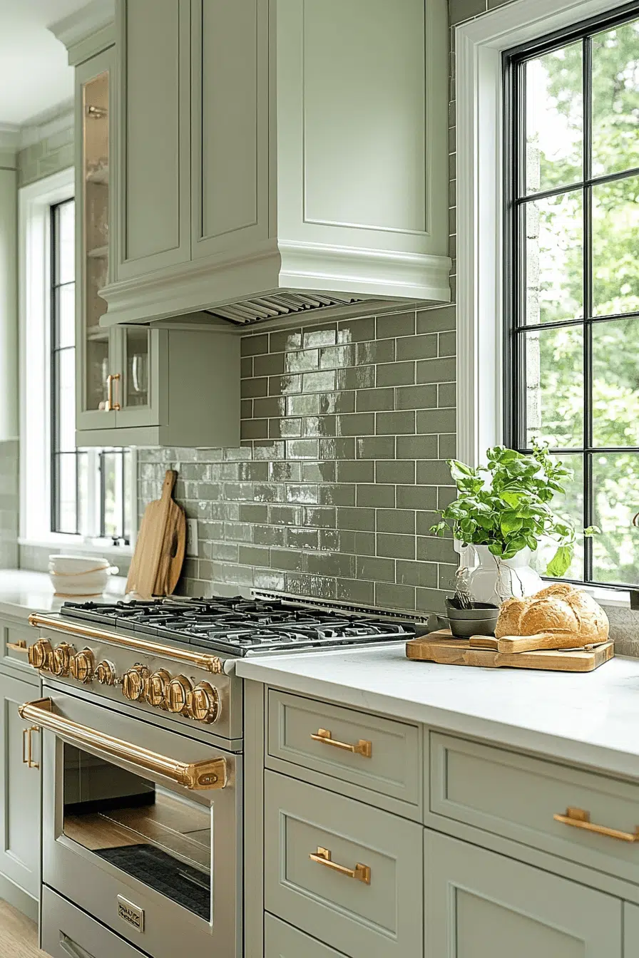 A soothing sage-tinted tile delivers understated elegance while keeping a green backsplash kitchen feeling calm and balanced. The soft gray-green undertone offers a refined alternative to beige without overwhelming the space. It blends beautifully with white shaker cabinets or warm oak finishes. Gentle light reflection adds brightness while preserving a cozy atmosphere. The overall look feels timeless, fresh, and effortlessly polished. Give your green backsplash kitchen a serene upgrade with this calming sage-inspired approach today.