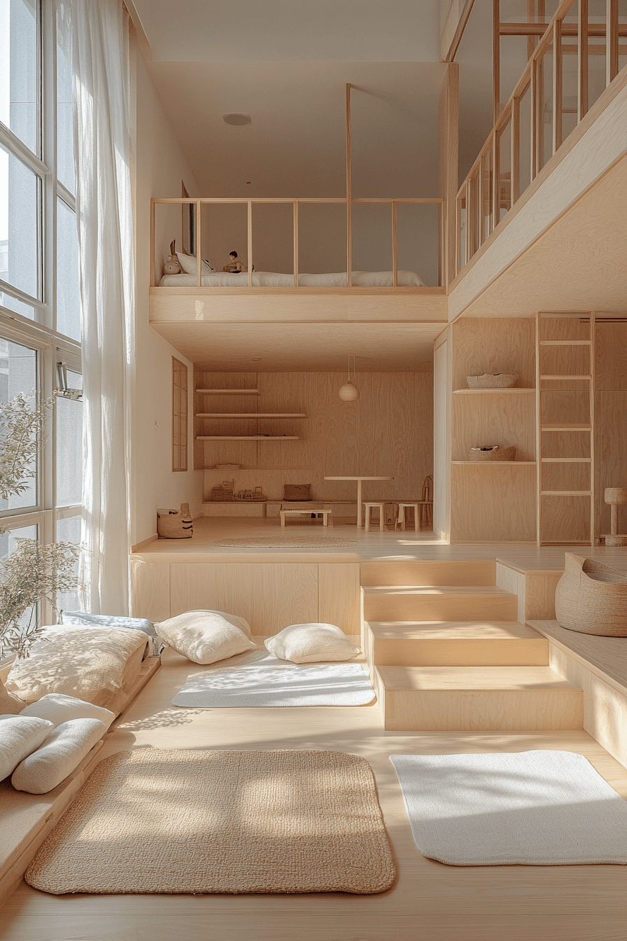 A sensory soft suite in a japandi kids room delights with textures that are pleasant and comforting. Think plush pillows, gentle curtains, and velvety rugs for hours of safe exploration. Furniture with rounded edges keeps things safe and smooth. It’s perfect for younger kids needing a gentle, engaging environment.