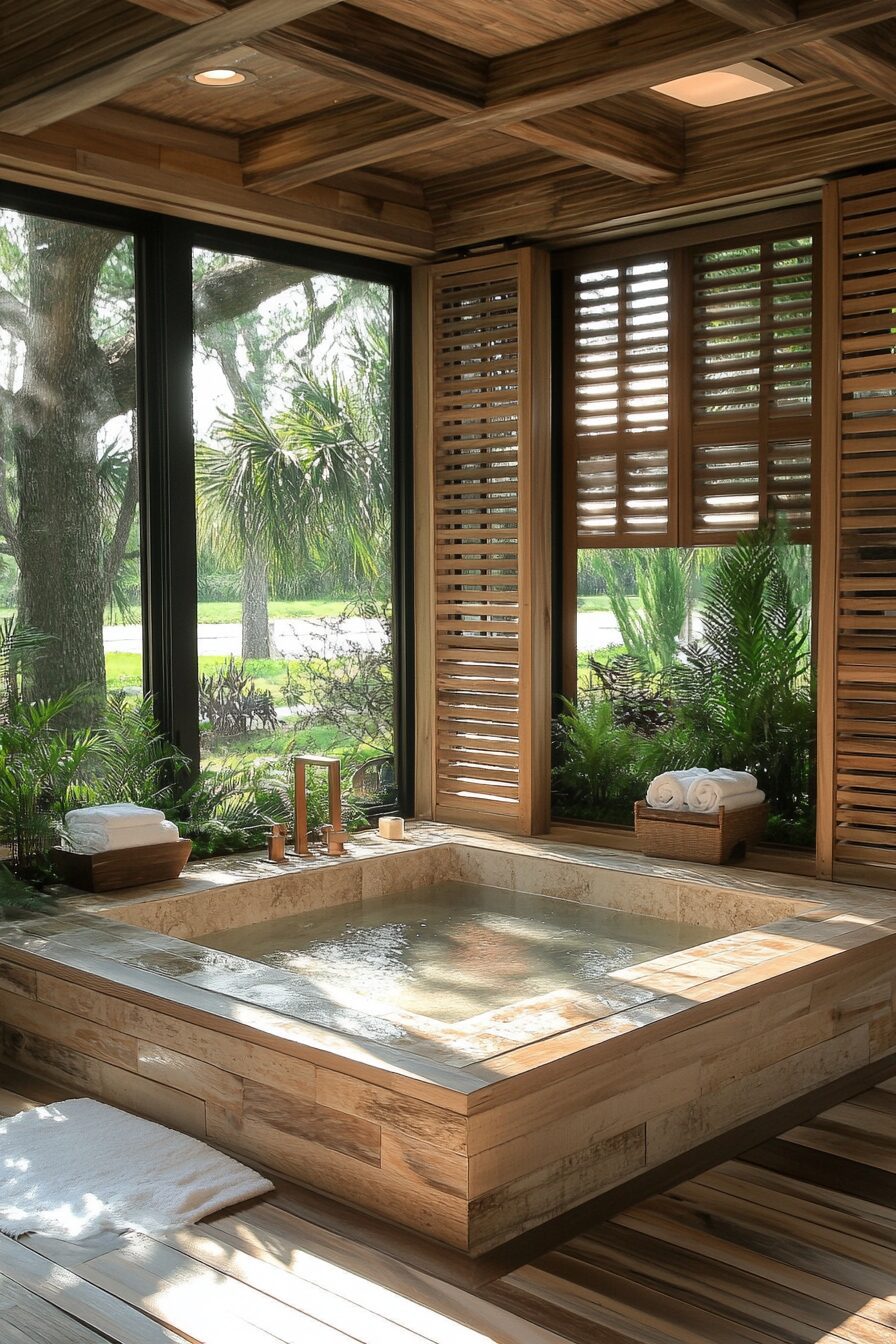 Transform your bathroom into a Japanese Tea House Retreat with natural wood, soft lighting, and minimalist decor. A simple wooden stool and a bamboo ladle add authenticity to the bathing experience. Gentle scents of cedar and rice paper lanterns complete the calming environment.
