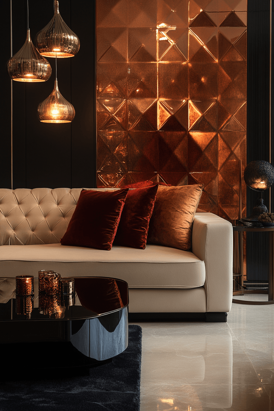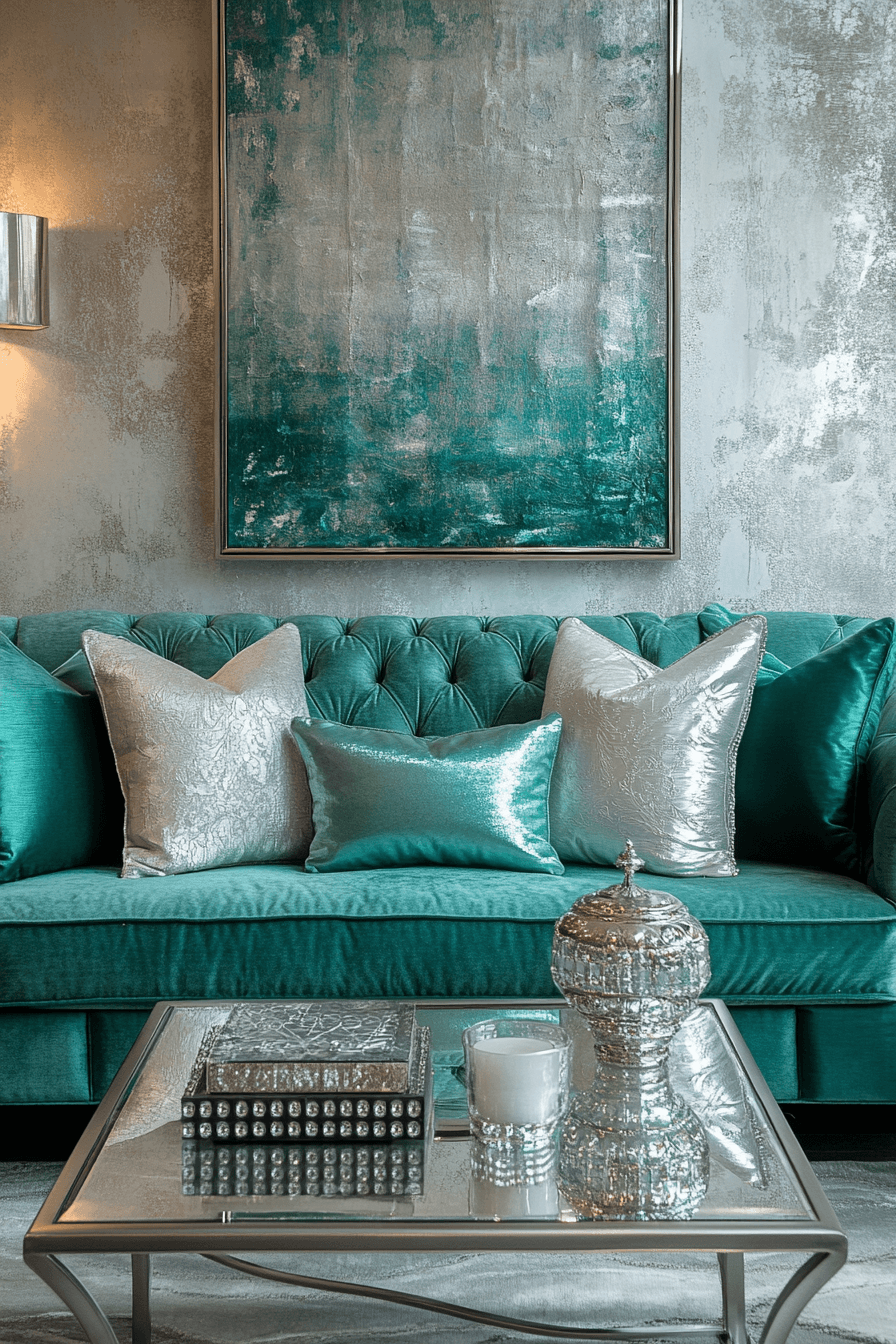 Platinum tones introduce sleek sophistication into contemporary jewel tone decor. The cool metallic hue balances bold jewel shades beautifully. Platinum looks striking in mirrors, trims, or lighting elements. Its shine brightens the palette without overpowering it. The overall design feels modern and refined. Tap to discover platinum glam jewel tone decor ideas.