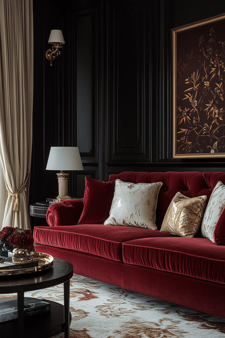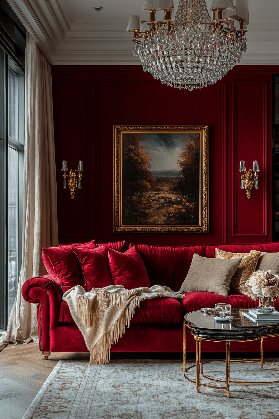 Garnet shades add cozy richness to luxurious jewel tone decor schemes. The deep wine-red tone works beautifully in velvet drapes, accent chairs, or layered textiles. Garnet creates warmth that makes a space feel inviting and comfortable. Metallic finishes such as copper or brass elevate its elegance. This shade blends beautifully with other jewel colors for a harmonious palette. Tap to discover garnet glam jewel tone decor ideas.