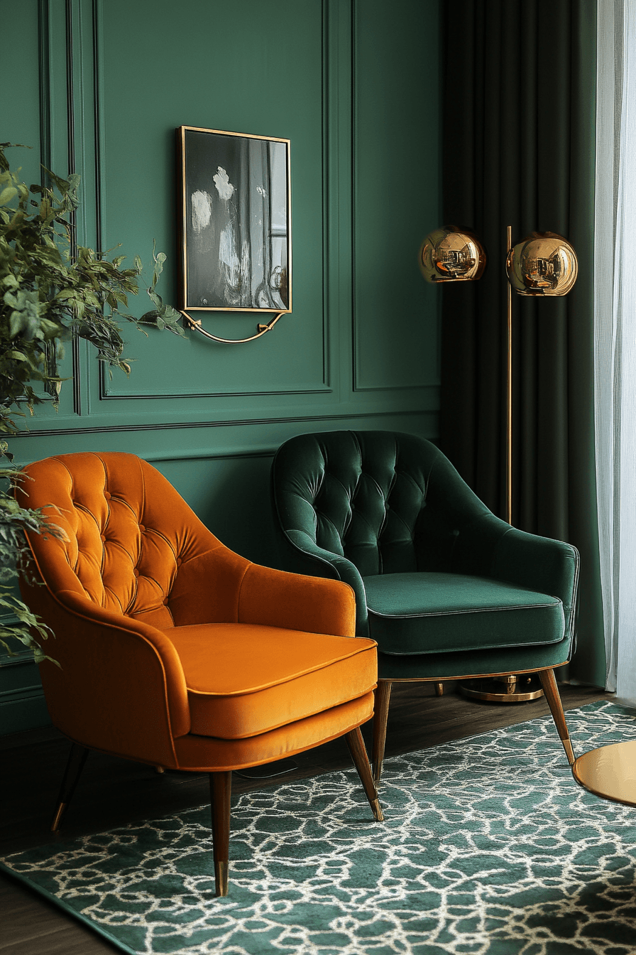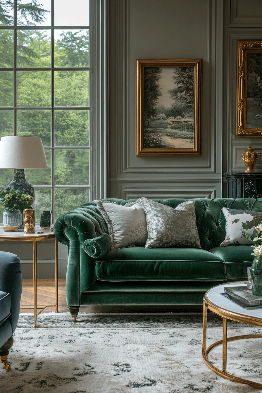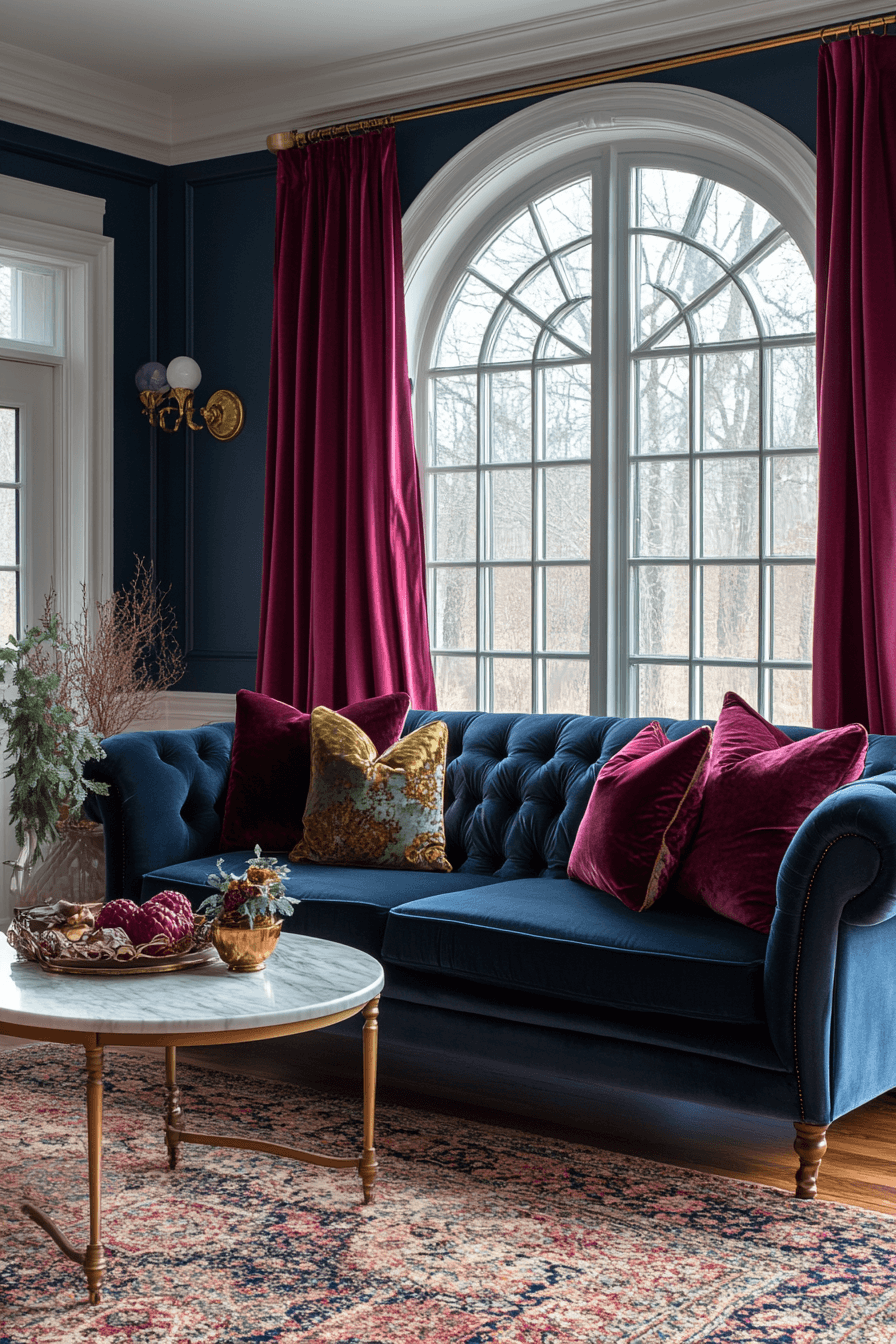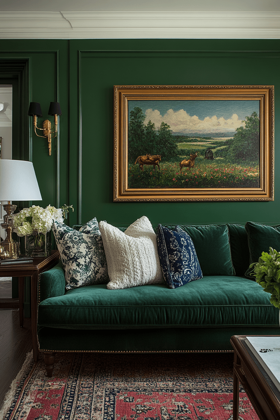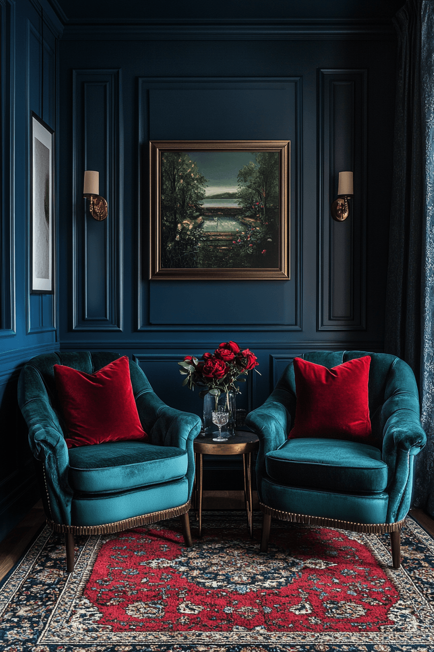 Deep saturated hues can define a luxurious jewel tone living room with dramatic impact. Emerald walls and navy sofas create a striking palette. Velvet fabrics enhance the richness of the colors. Gold-framed artwork adds elegance and interest. Soft lighting keeps the space warm and welcoming. Click to explore deep jewel tone living room inspiration.