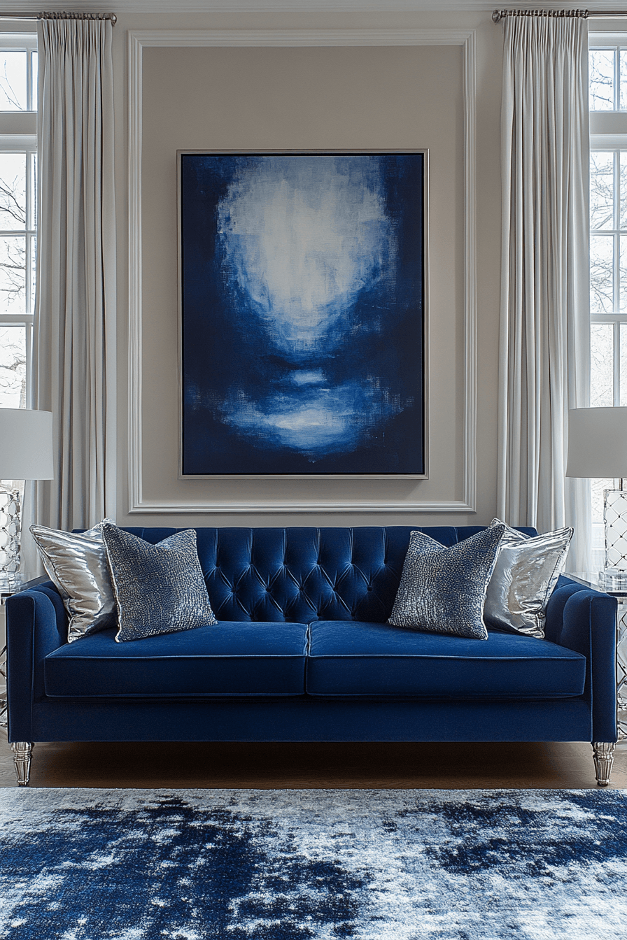 A sapphire-focused jewel tone living room offers a sleek and contemporary look. Deep blue seating creates richness while neutral walls keep the space open. Silver or chrome accents introduce modern shine. A sapphire rug grounds the palette beautifully. Layered lighting helps the deep hue feel vibrant and welcoming. Tap to explore sapphire-inspired jewel tone living room designs.