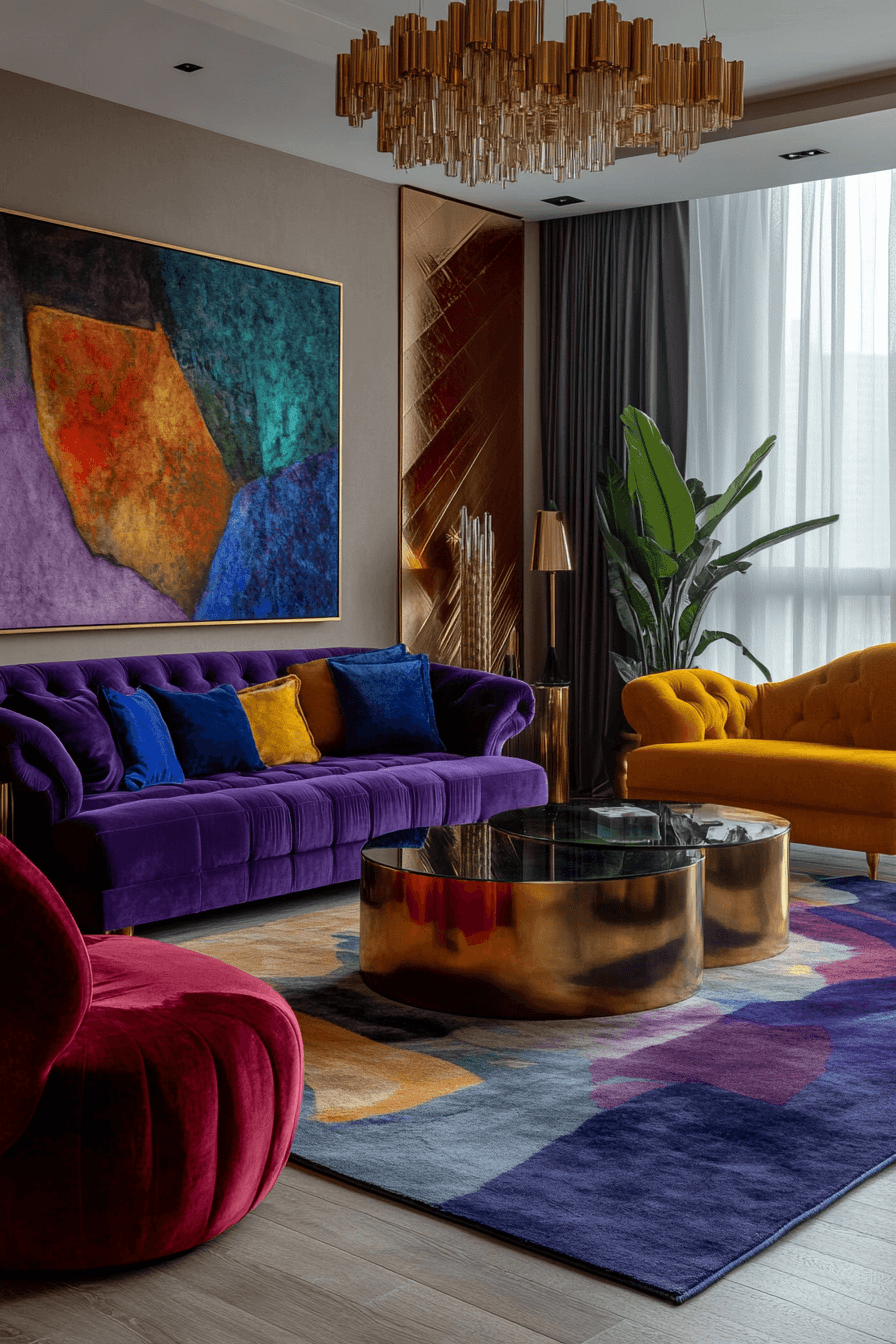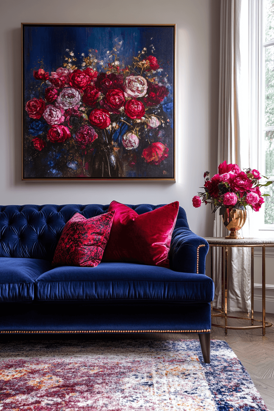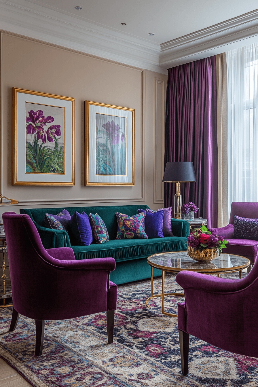 Strong colors paired with graceful details create bold elegance in a jewel tone living room. Sapphire sofas combined with ruby accents deliver confident style. Gold trim introduces refined detail. Oversized artwork in jewel shades anchors the design. Neutral rugs maintain visual balance. Tap to discover elegant jewel tone living room ideas.