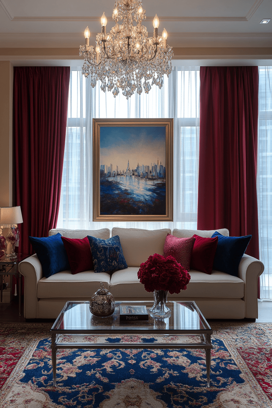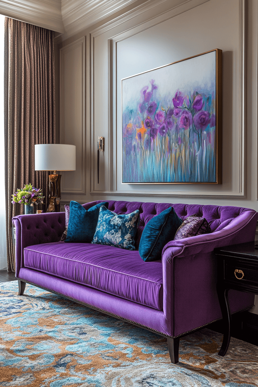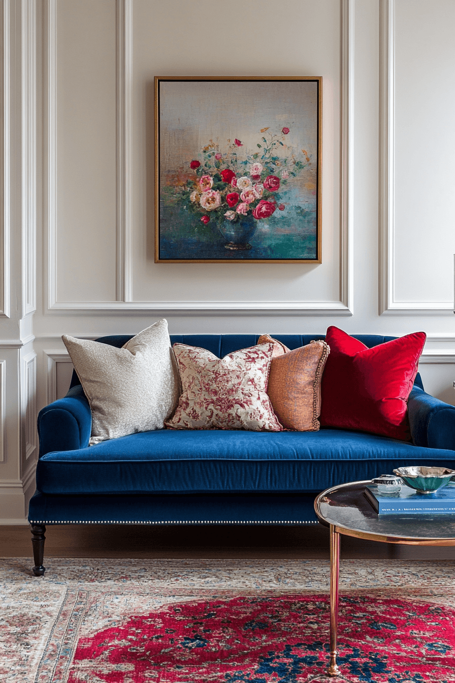 Strong colors paired with graceful details create bold elegance in a jewel tone living room. Sapphire sofas combined with ruby accents deliver confident style. Gold trim introduces refined detail. Oversized artwork in jewel shades anchors the design. Neutral rugs maintain visual balance. Tap to discover elegant jewel tone living room ideas.