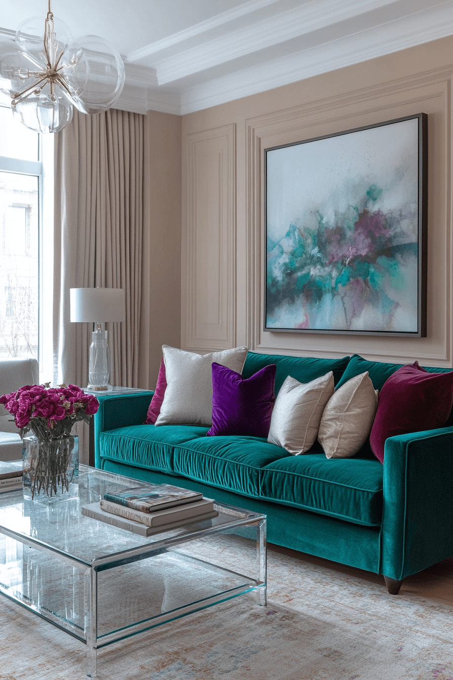 Crystal and glass accents can make a jewel tone living room feel brighter while enhancing the depth of rich colors. Sapphire pillows and ruby curtains gain extra sparkle when paired with reflective decor. Glass coffee tables and crystal vases scatter light across the room. The shimmer creates a luxurious yet airy atmosphere. Neutral walls help maintain balance in the design. Click to discover more crystal-inspired jewel tone living room styles.