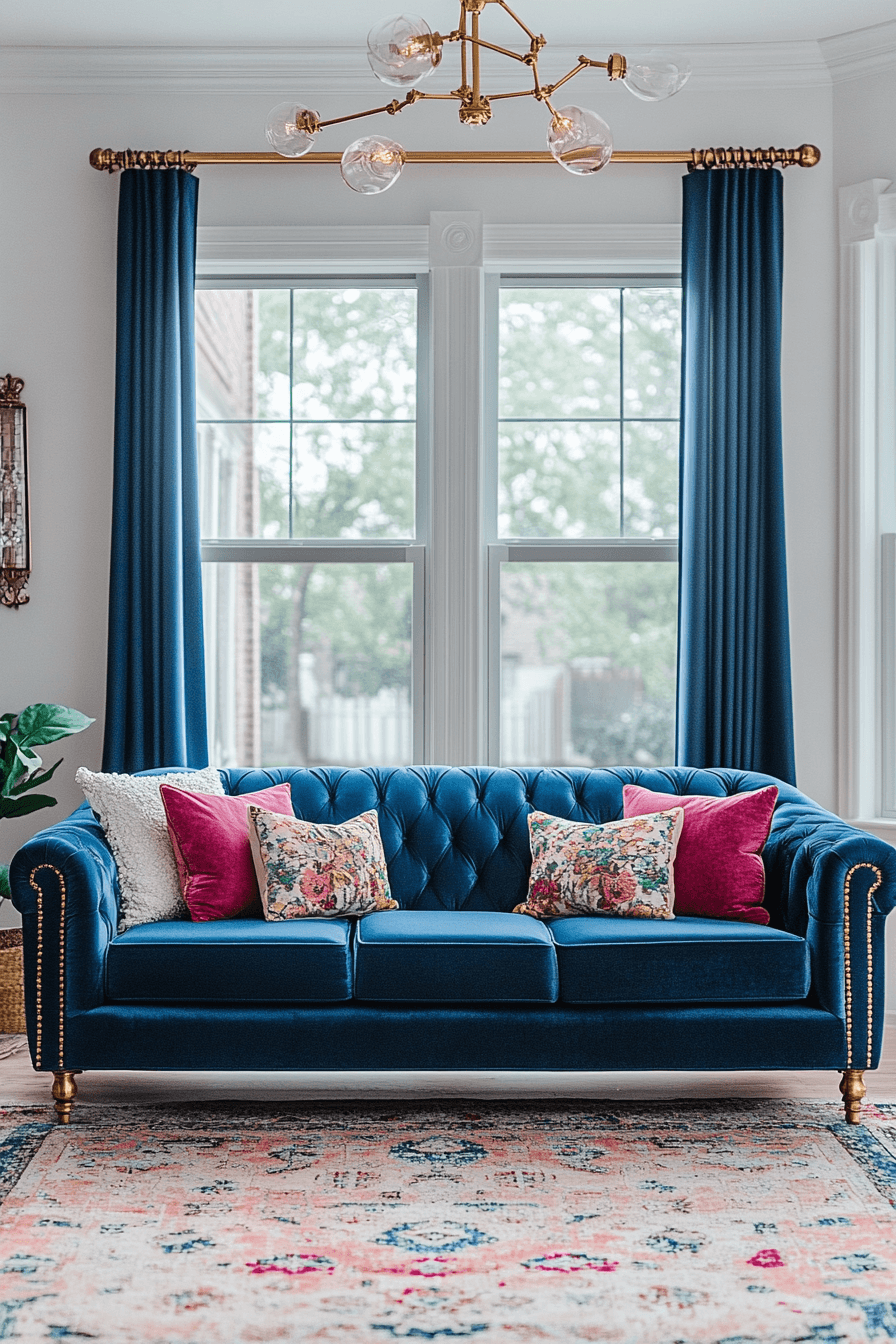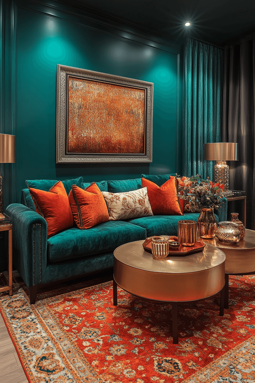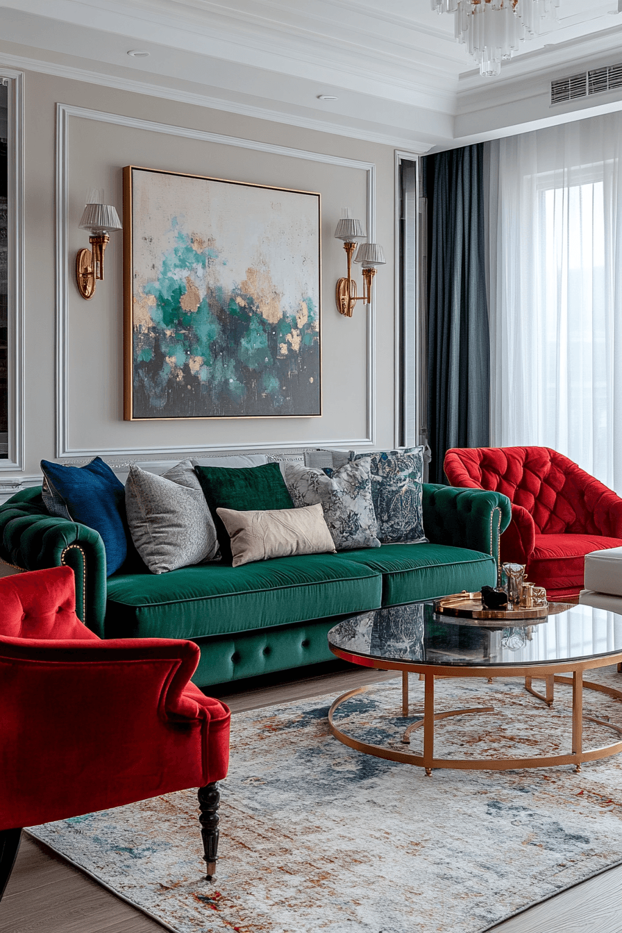 Using strong color combinations can make a jewel tone living room feel both dramatic and refined. An emerald sofa paired with sapphire chairs creates a striking visual foundation. Throw pillows in additional jewel hues add depth and personality. Gold accents introduce subtle glamour. Neutral walls keep the palette balanced. Click to explore bold jewel tone living room color ideas.