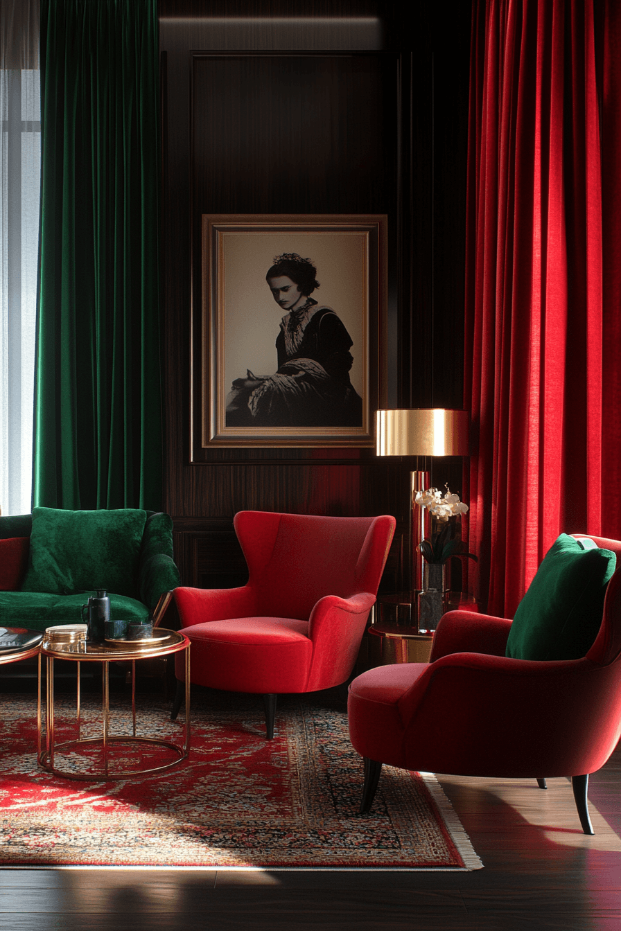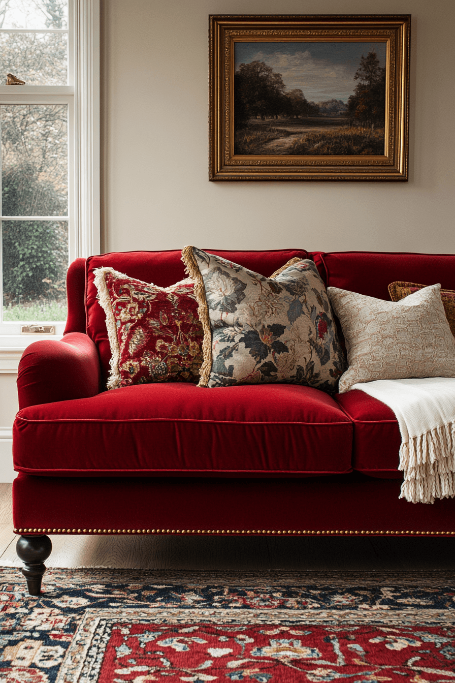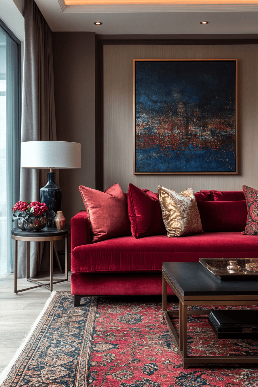 Ruby seating introduces warmth and personality to a stylish jewel tone living room palette. The deep red shade creates a striking focal point. Gold accents enhance the luxurious atmosphere. Neutral walls balance the bold color. Plush rugs increase comfort and elegance. Click to see ruby-inspired jewel tone living room ideas.