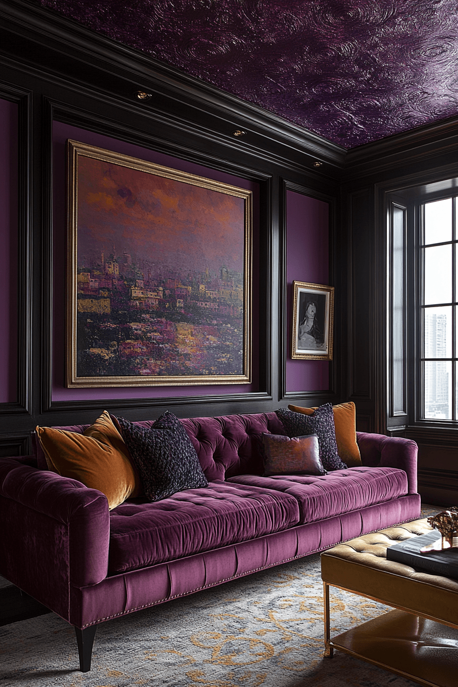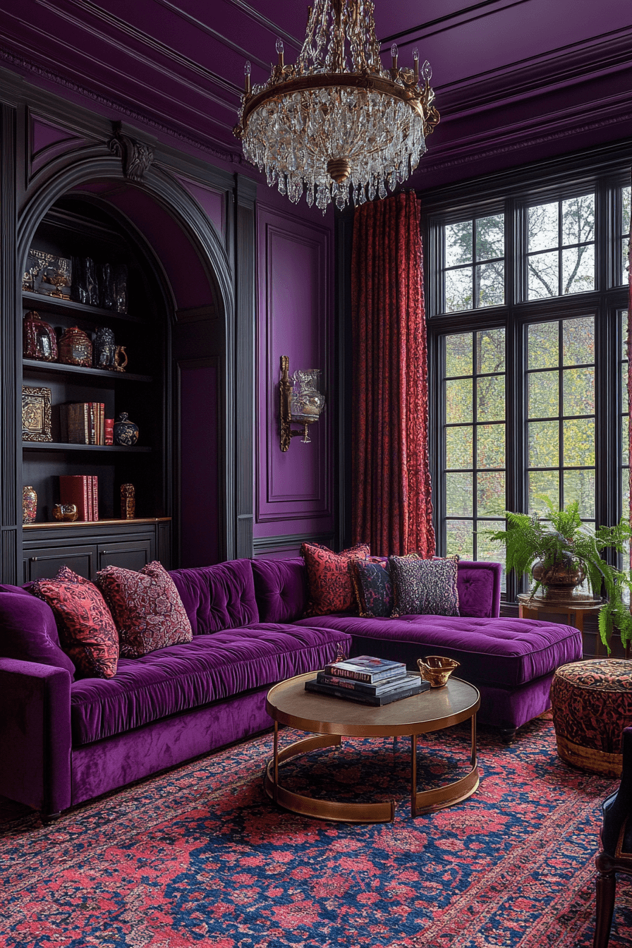 A jewel tone living room inspired by royal colors brings drama and luxury into the space. Deep amethyst or sapphire walls instantly create a regal atmosphere. Plush seating in complementary jewel shades adds comfort and richness. Metallic accents in gold or bronze enhance the upscale vibe. Statement artwork ties the palette together beautifully. Tap to explore more royal-inspired jewel tone living room ideas.