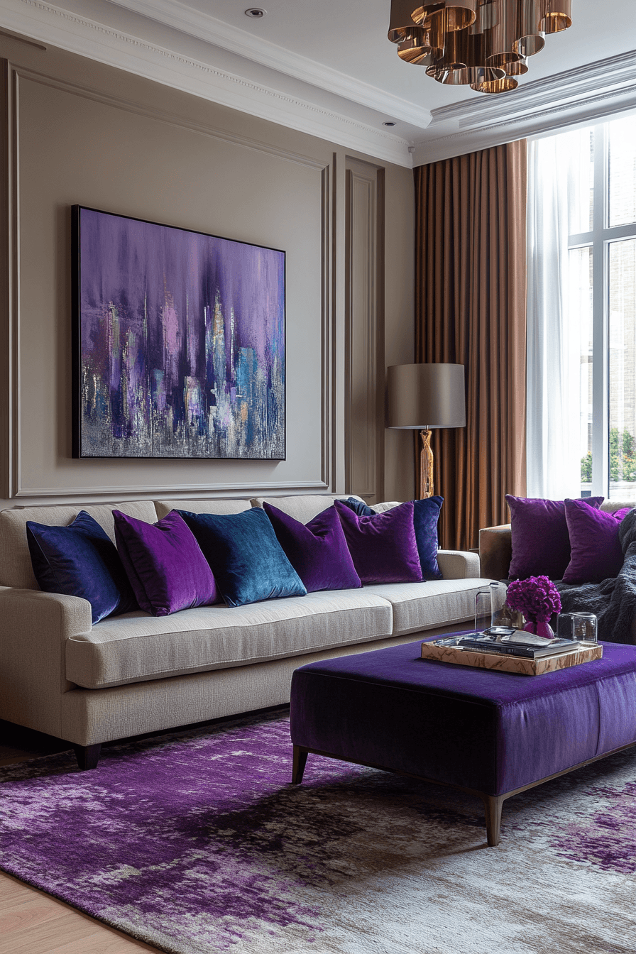 Combining multiple jewel shades can create majestic drama in a bold jewel tone living room. Amethyst, emerald, and sapphire tones layered throughout the space form a regal palette. Bronze or gold accents enhance the luxurious mood. Textured curtains and pillows add warmth and dimension. Large artwork completes the statement look. Tap to explore majestic jewel tone living room inspiration.