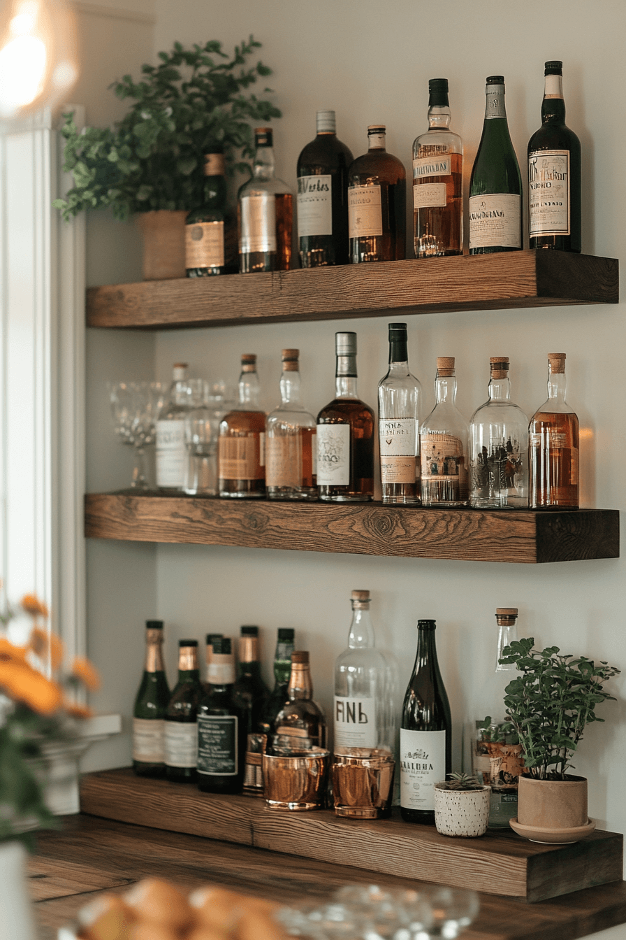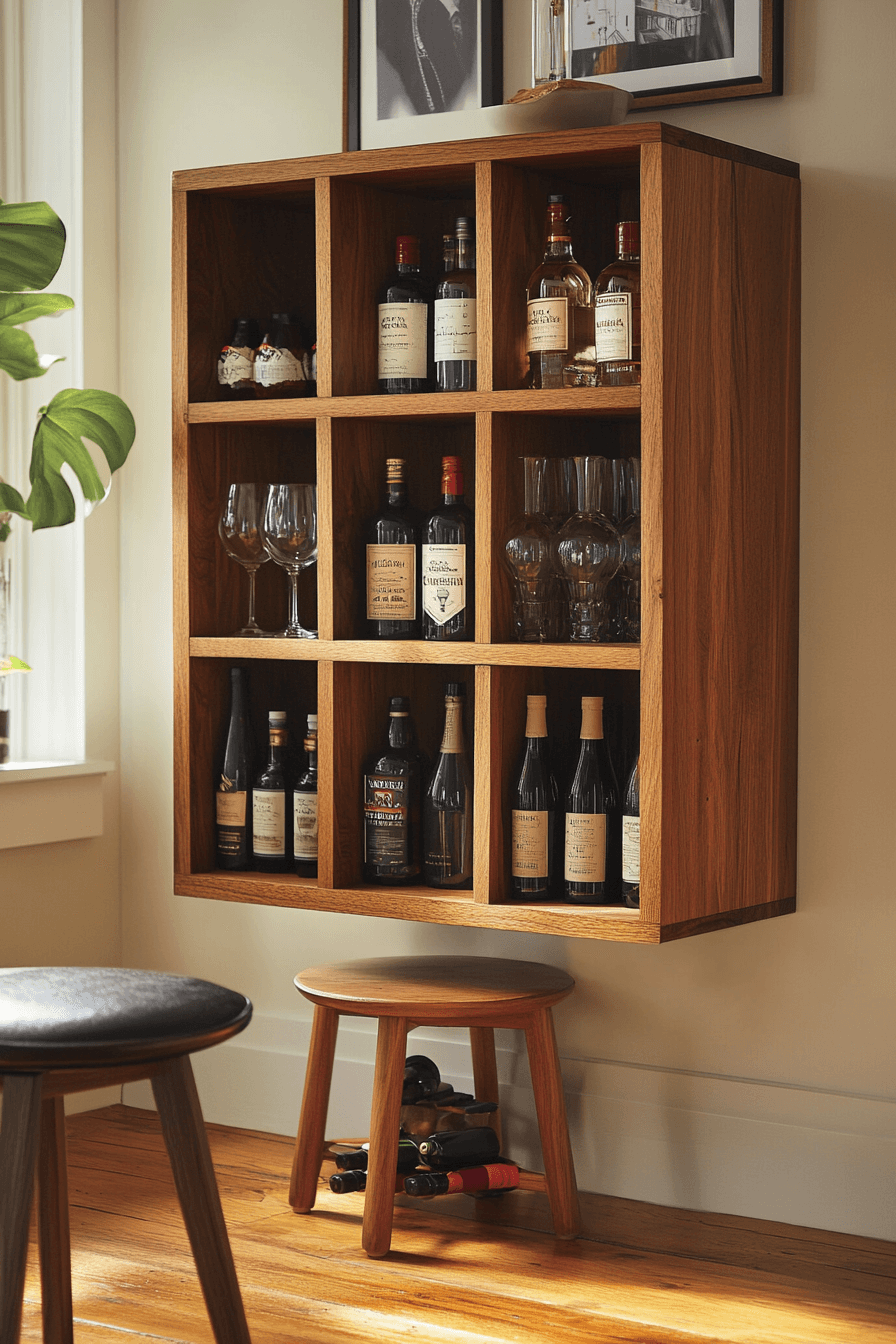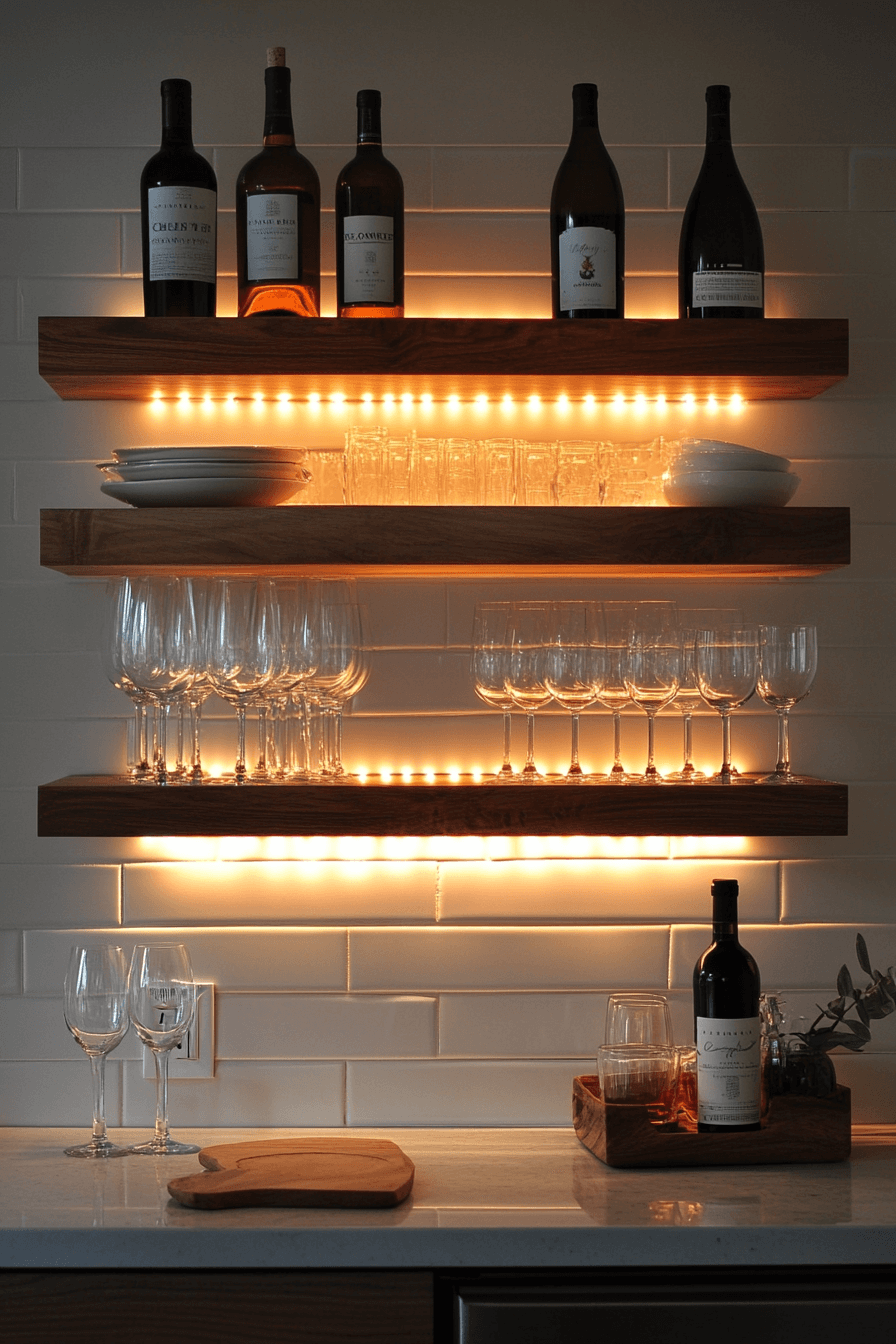 Floating storage keeps interiors feeling open, reinforcing the beauty of mini bar ideas small spaces design. Shelves mounted above eye level free up valuable floor space. Bottles and glassware remain easy to access. Subtle lighting adds a refined touch. Clean and effortless.