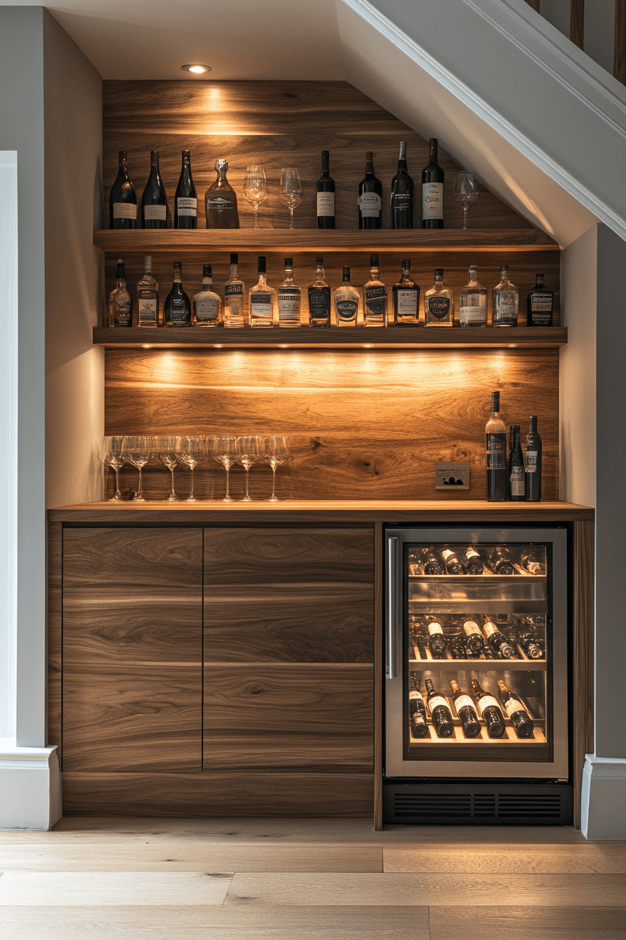 Unused stair zones become standout features through thoughtful mini bar ideas small spaces design. Built-in shelving and counters turn awkward gaps into useful areas. Accent lighting adds warmth and polish. The bar feels custom-made. A smart use of overlooked space.