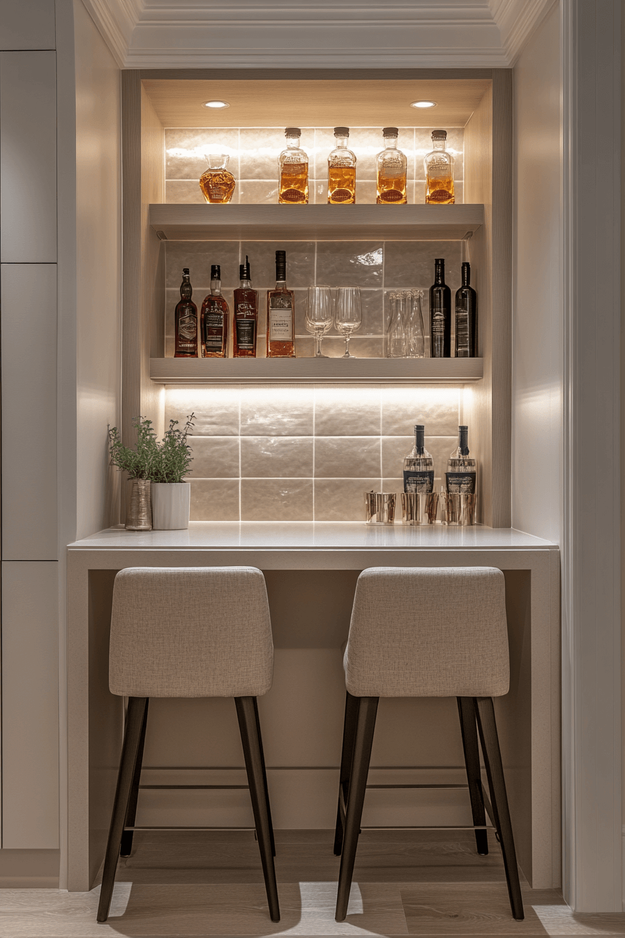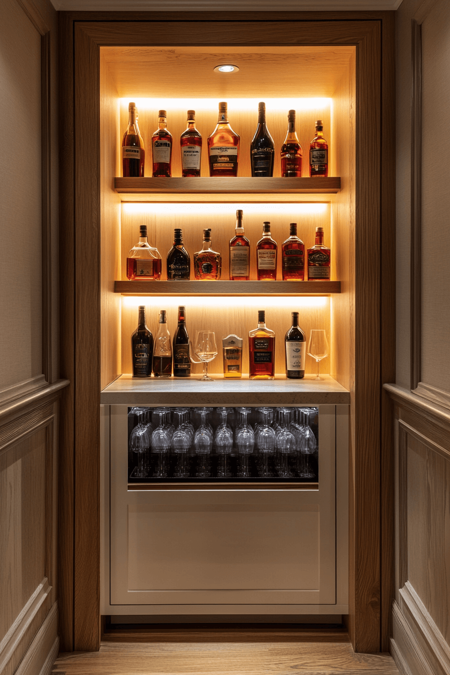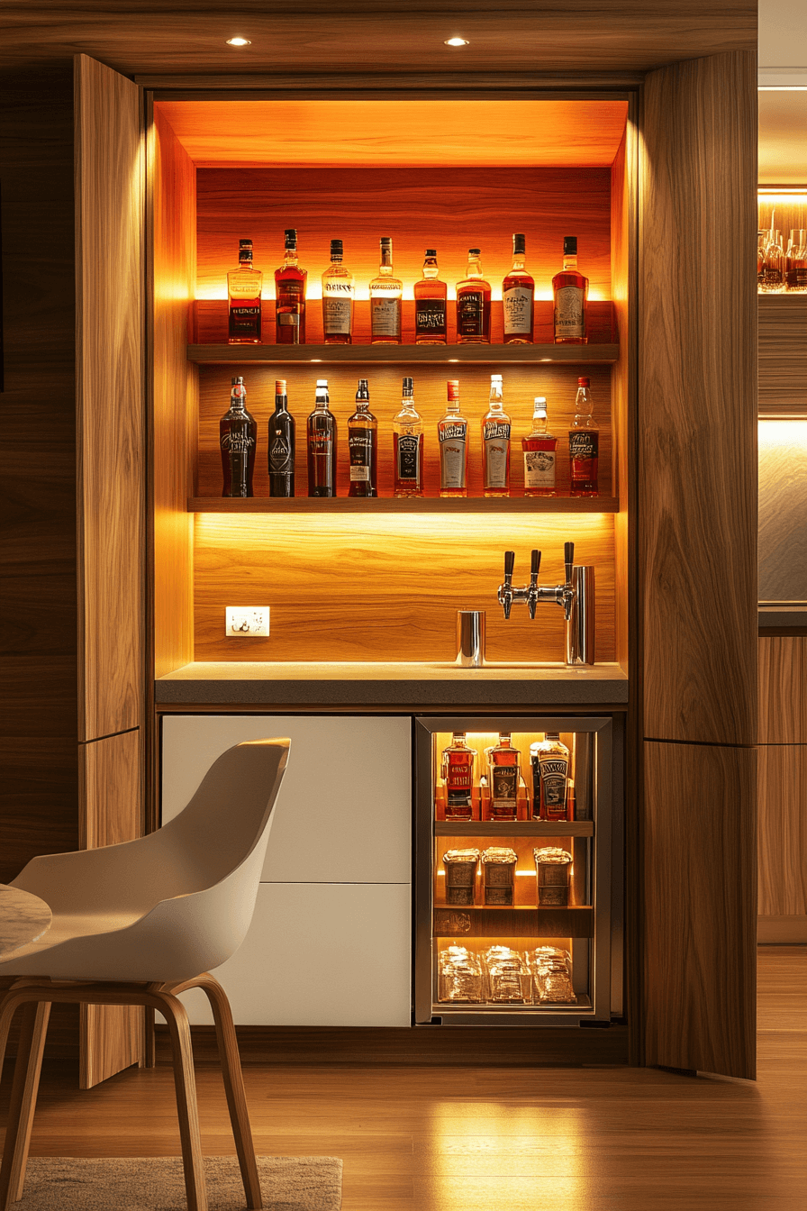 Integrated lighting transforms compact bars into visual highlights, enhancing mini bar ideas small spaces design. LED accents spotlight bottles beautifully. A slim counter completes the look. The glow adds warmth and style. Artistic yet practical.