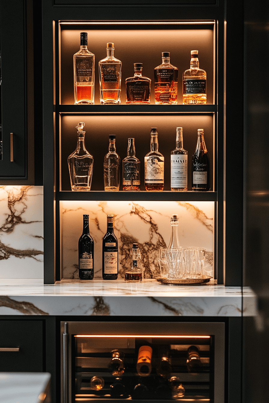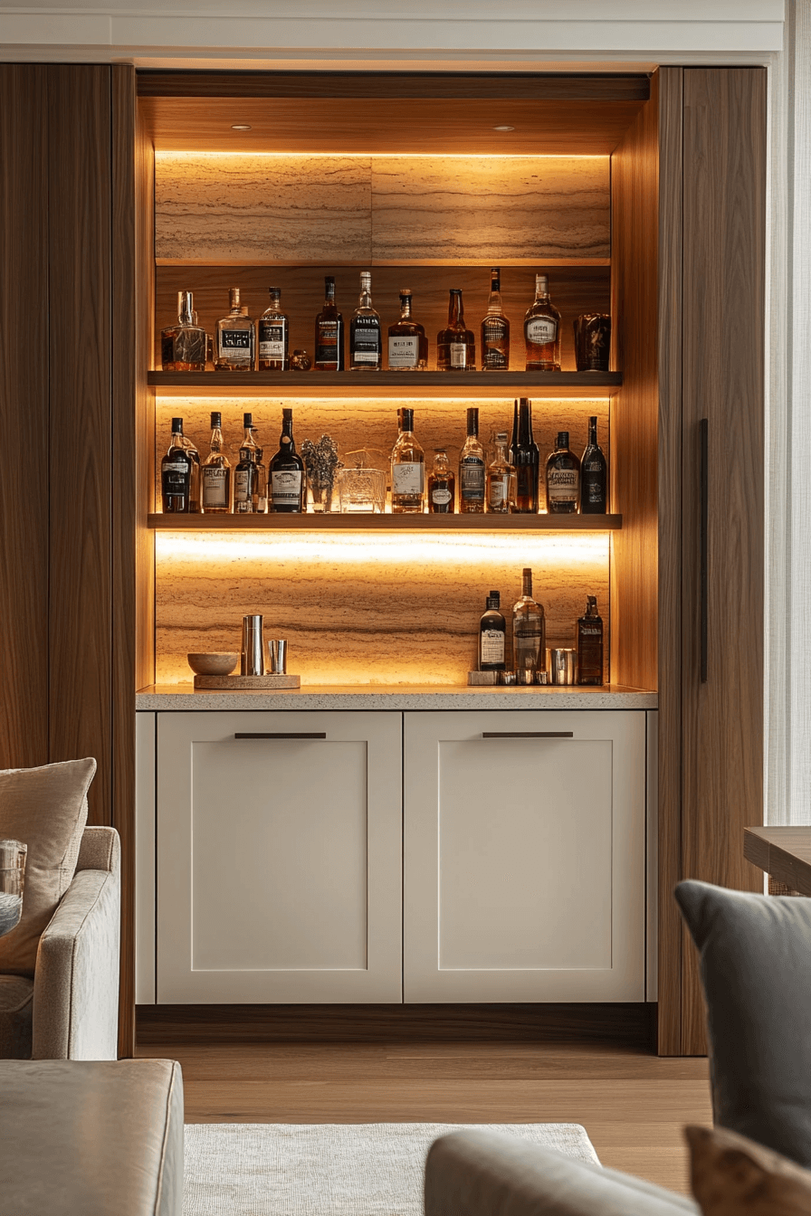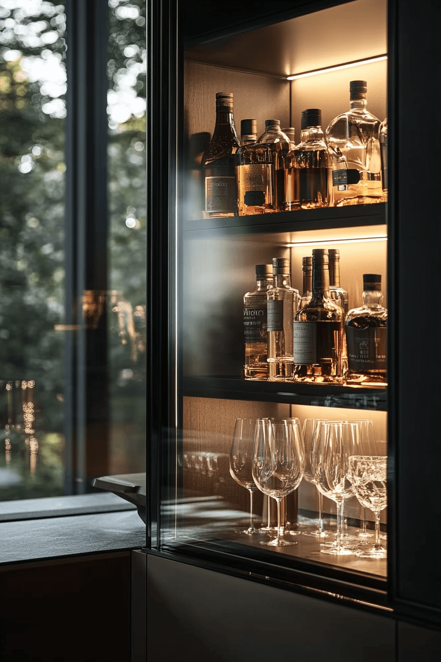 Integrated lighting transforms compact bars into visual highlights, enhancing mini bar ideas small spaces design. LED accents spotlight bottles beautifully. A slim counter completes the look. The glow adds warmth and style. Artistic yet practical.