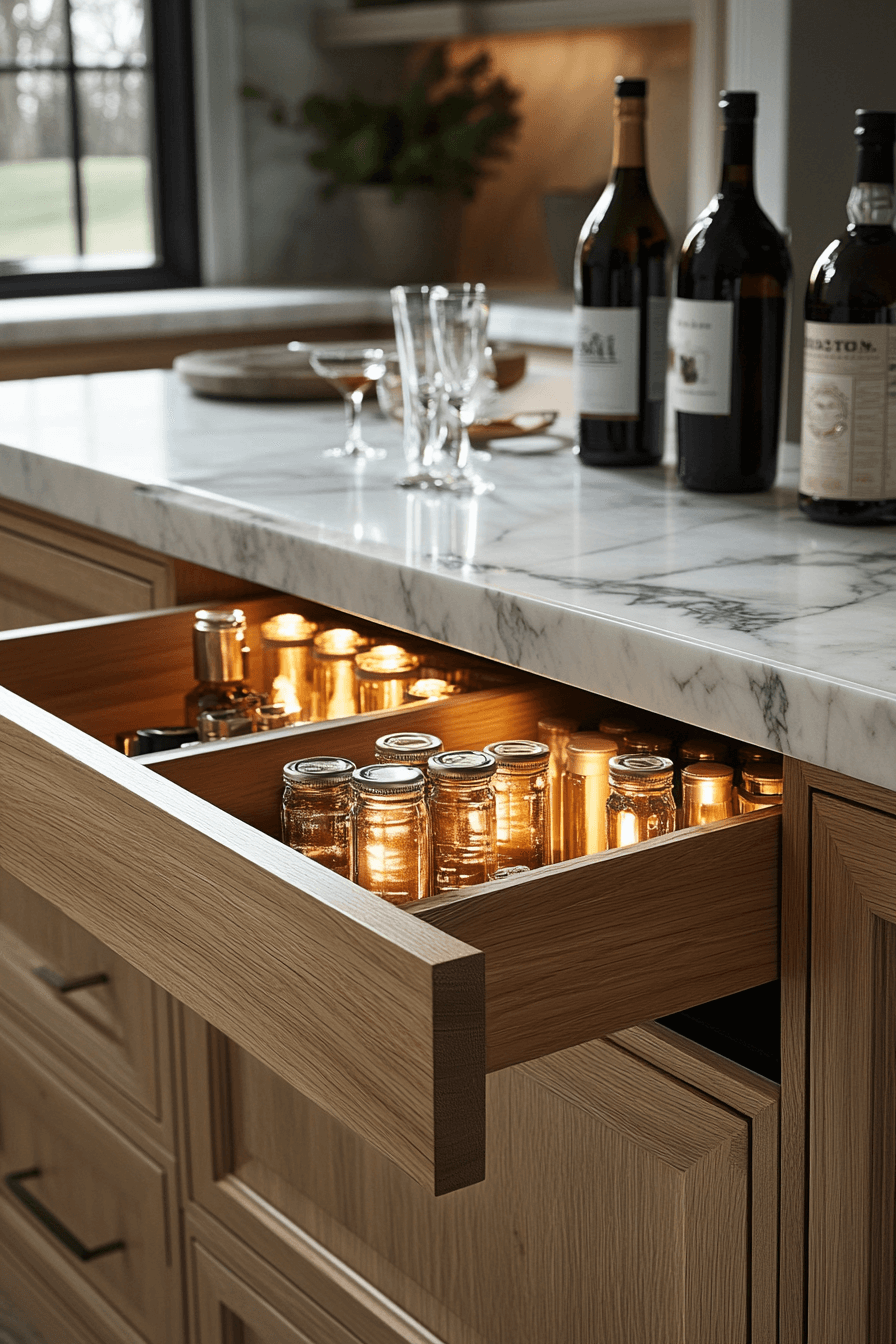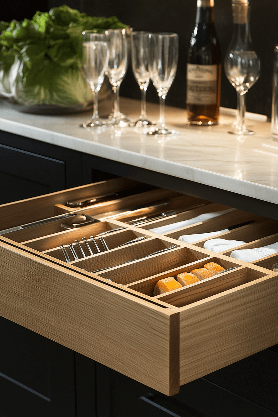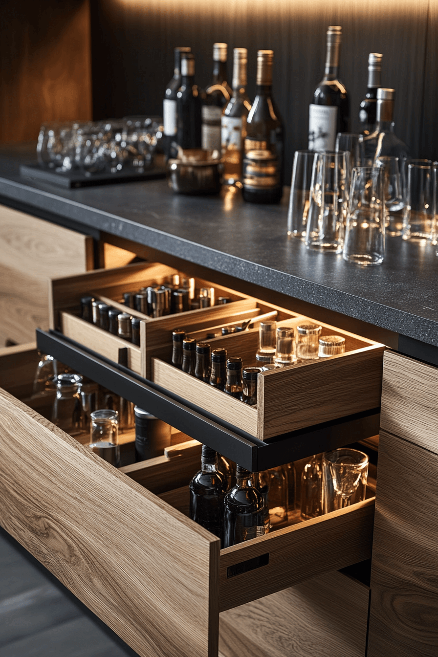 Dedicated drawer compartments bring order and elegance to mini bar ideas small spaces design. Deep storage keeps bottles secure. Dividers maintain structure. Soft-close hardware adds polish. Discreet yet impressive.