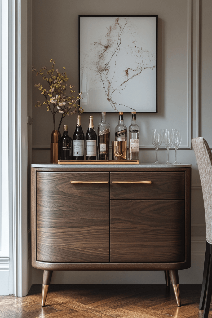 Tall storage furniture maximizes capacity while staying slim, enhancing mini bar ideas small spaces design. Upper shelves display essentials. Lower compartments hide extras. Clean lines keep it contemporary. Compact and elegant.