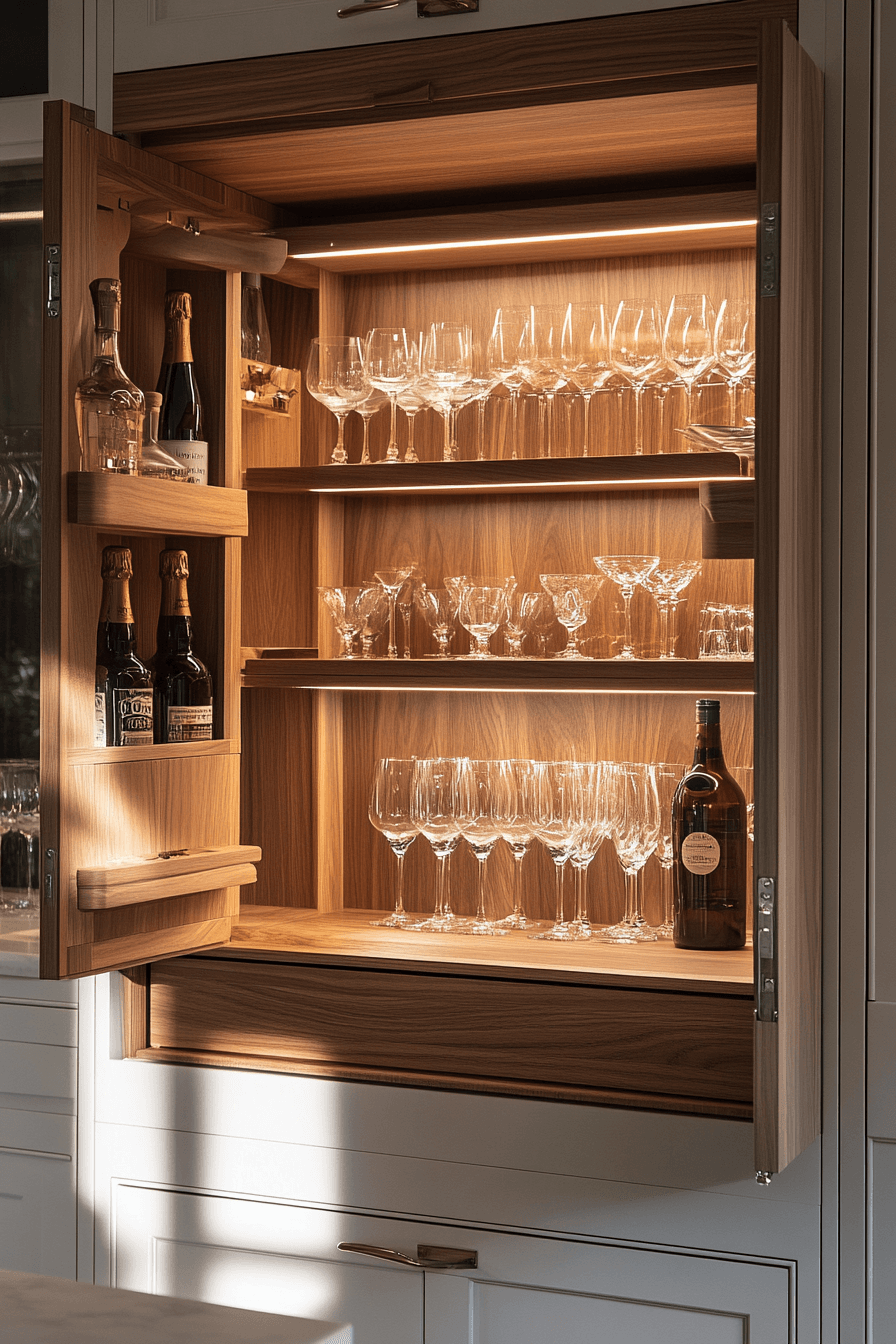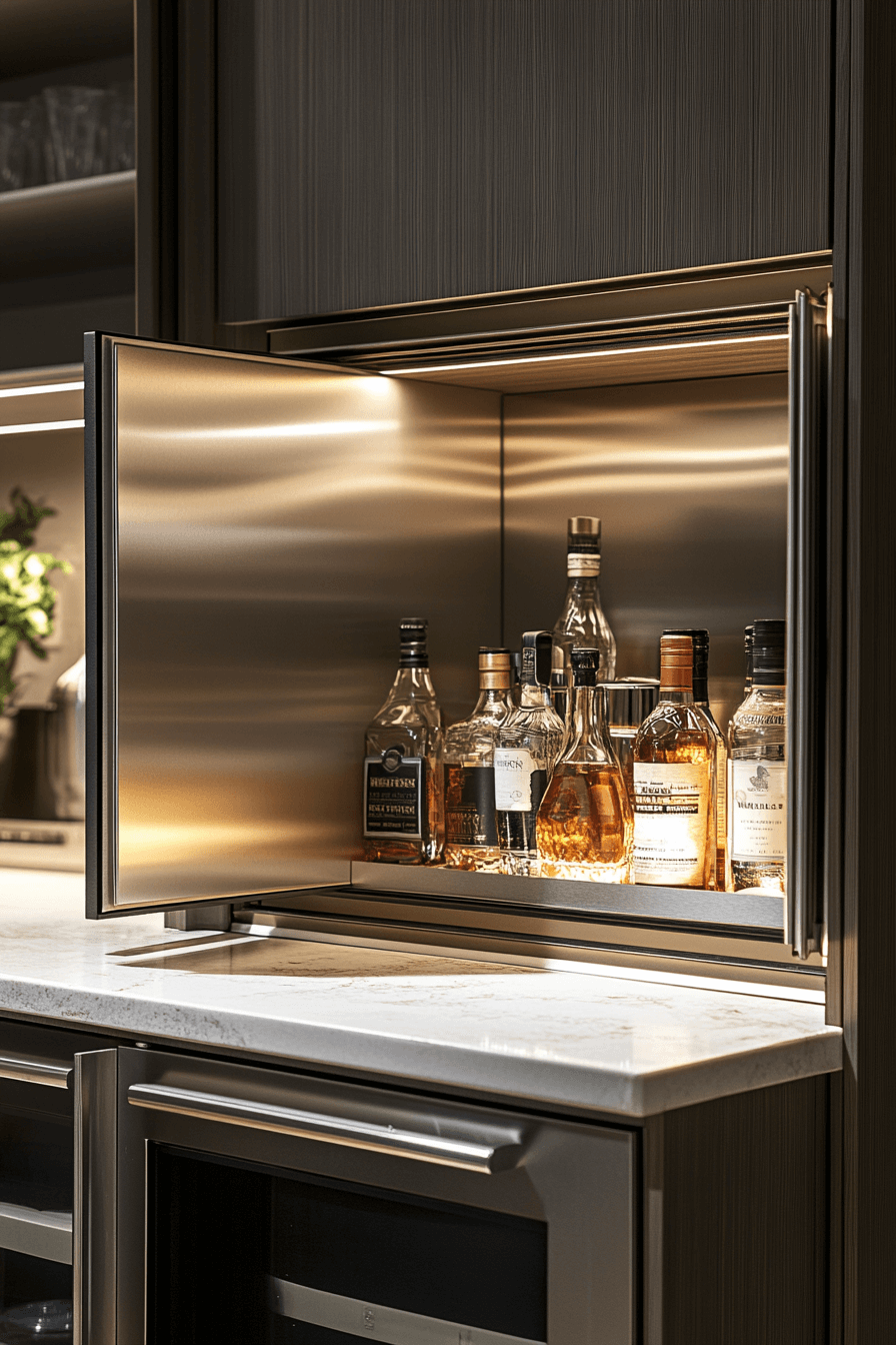 Slide-out drink stations deliver convenience while staying hidden, aligning with mini bar ideas small spaces design. Storage remains concealed until use. Compartments keep everything organized. Smooth motion enhances the experience. Ideal for entertaining in tight spaces.