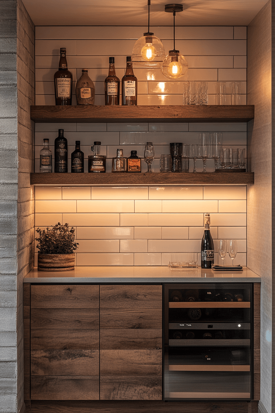 Maximizing vertical wall space creates an instant upgrade in mini bar ideas small spaces design. A tall, wall-based setup keeps bottles and glassware neatly arranged without crowding the floor. The design feels sleek and intentional, perfect for modern interiors. Everything stays visible yet organized. It’s efficient and stylish in equal measure.