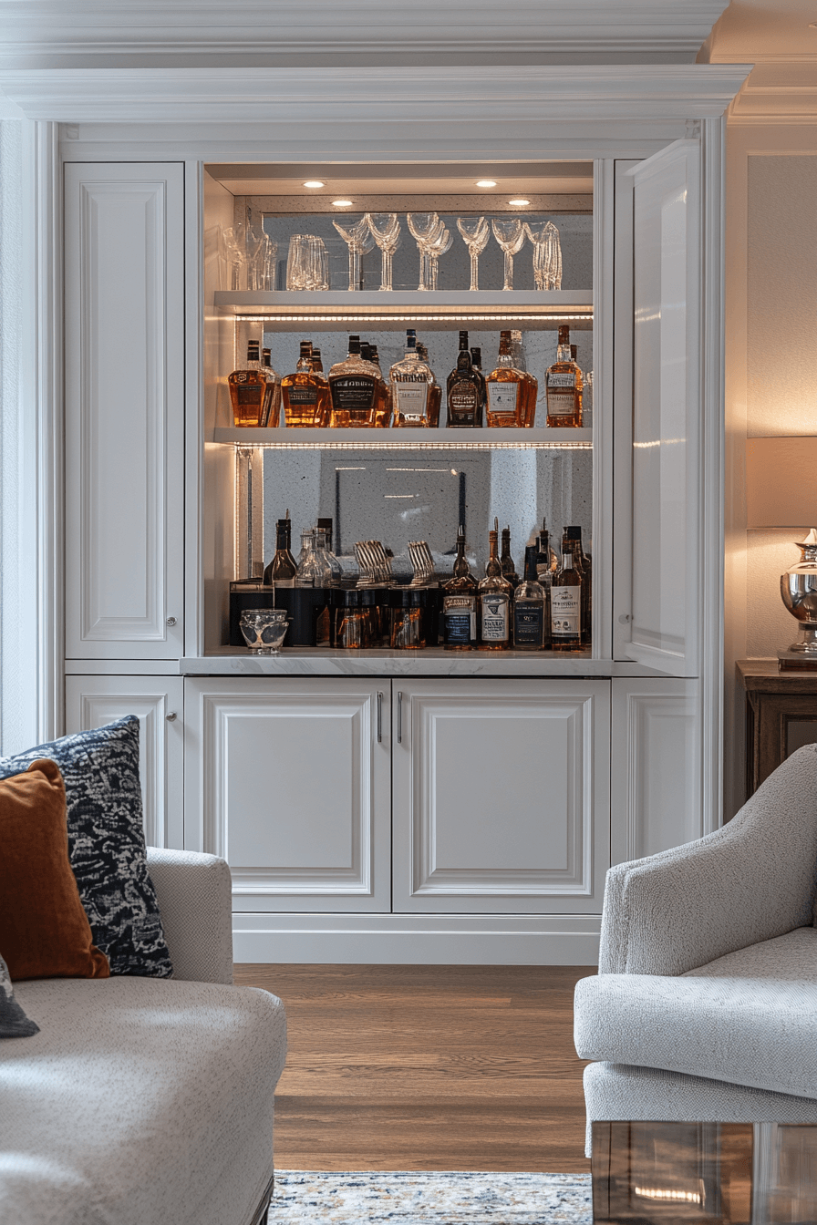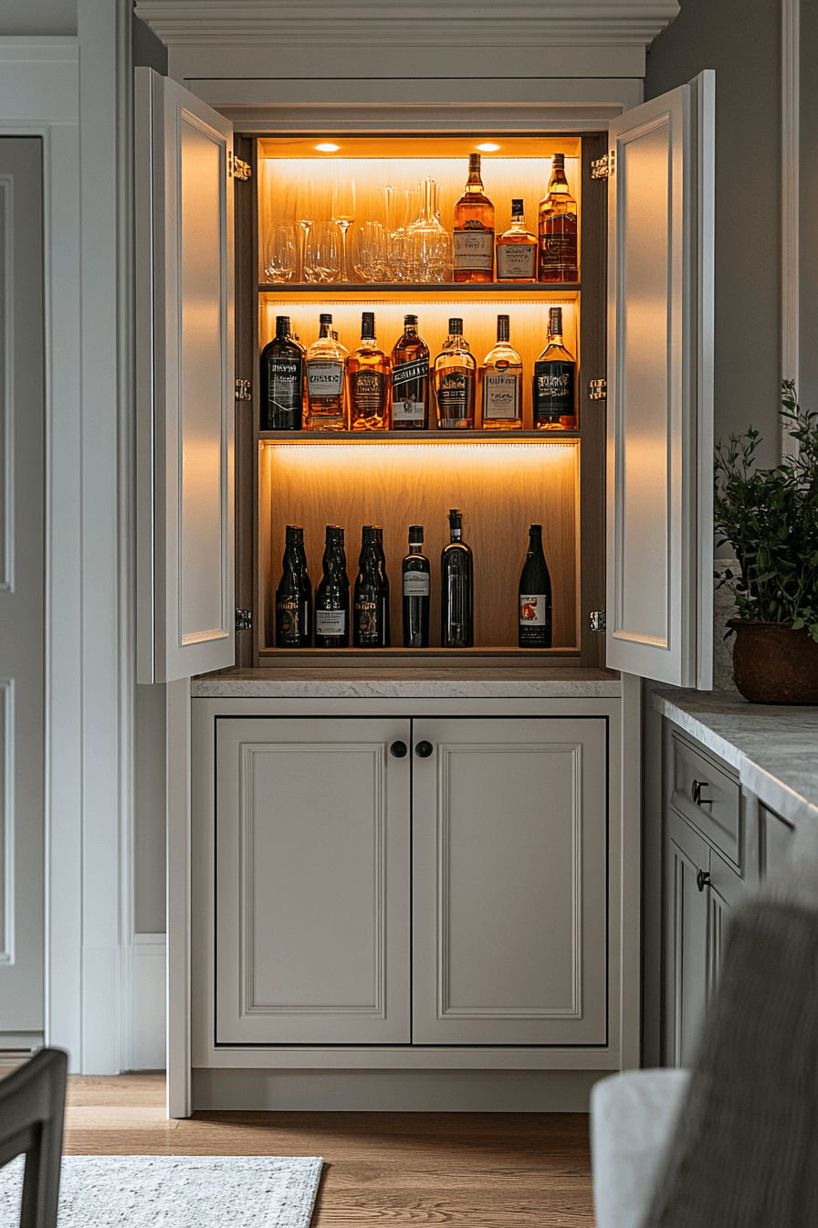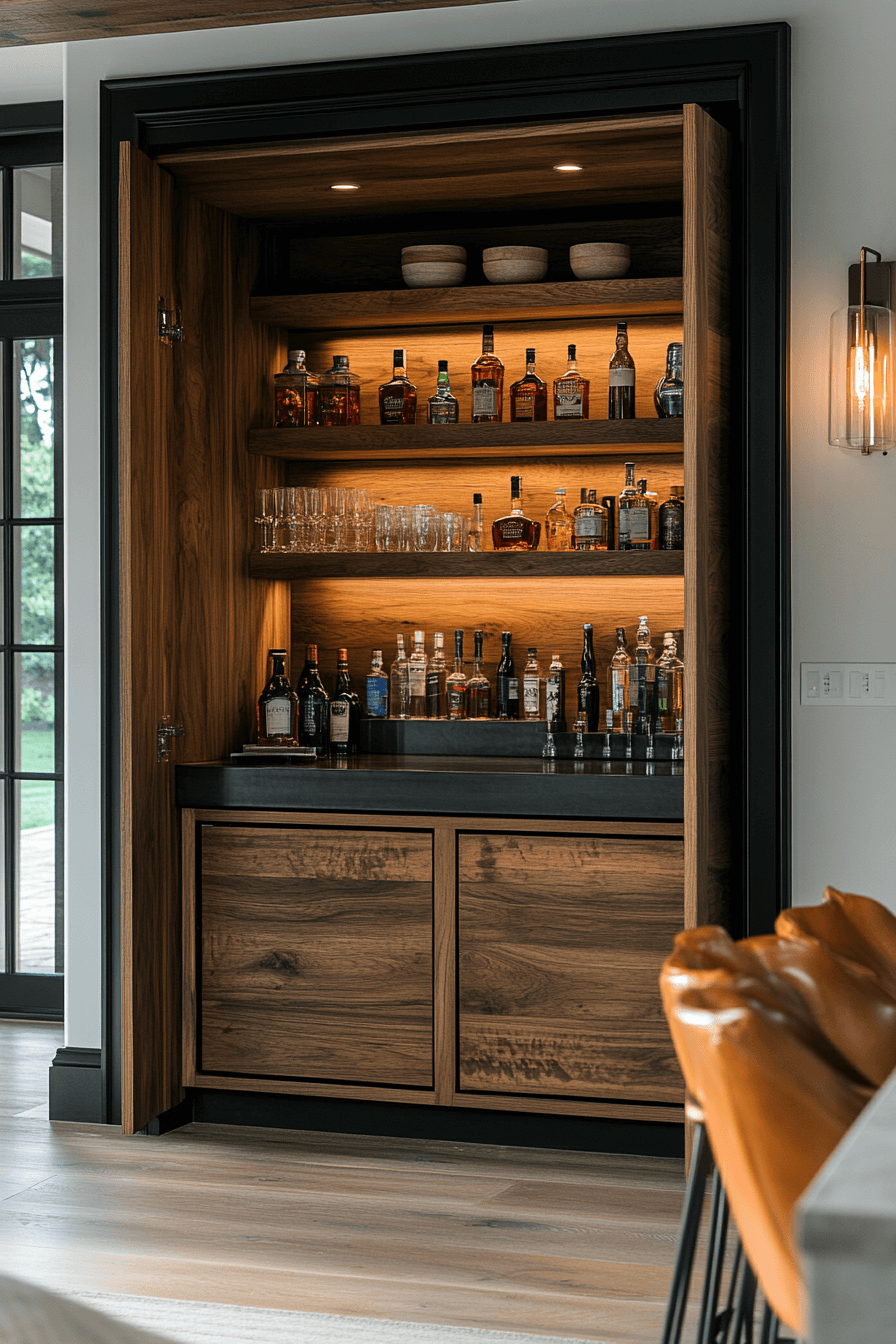 Blending your bar into existing cabinetry creates a seamless look in mini bar ideas small spaces design. Closed doors maintain a clean exterior. Inside, everything is thoughtfully organized. Matching finishes elevate cohesion. It’s refined and highly practical.