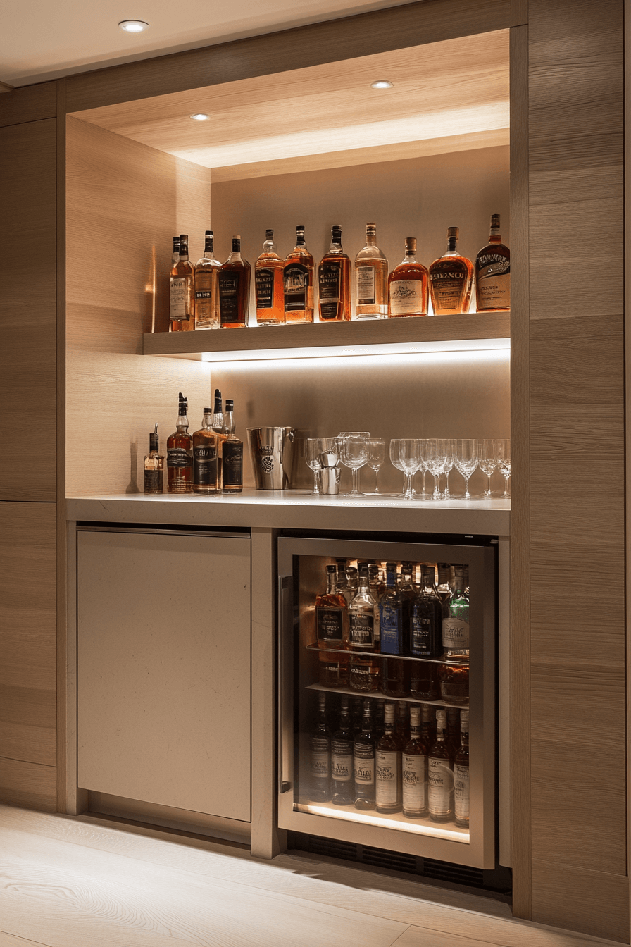Recessed drink stations blend into architecture beautifully, reinforcing mini bar ideas small spaces design. Built-in shelves create a tidy, intentional look. Coordinated finishes ensure visual flow. Lighting adds depth without clutter. Clean and cohesive.