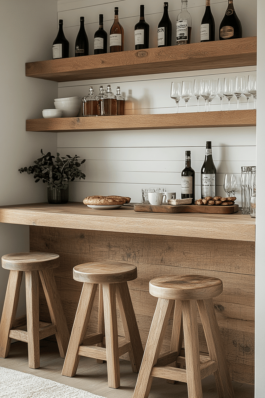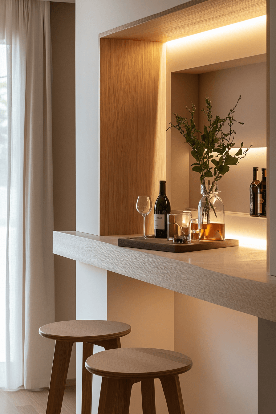 Multi-use counters blend daily routines with entertaining, reinforcing mini bar ideas small spaces design. Morning coffee transitions into evening cocktails effortlessly. Minimal accessories keep things tidy. Seating adds flexibility. Seamless integration.