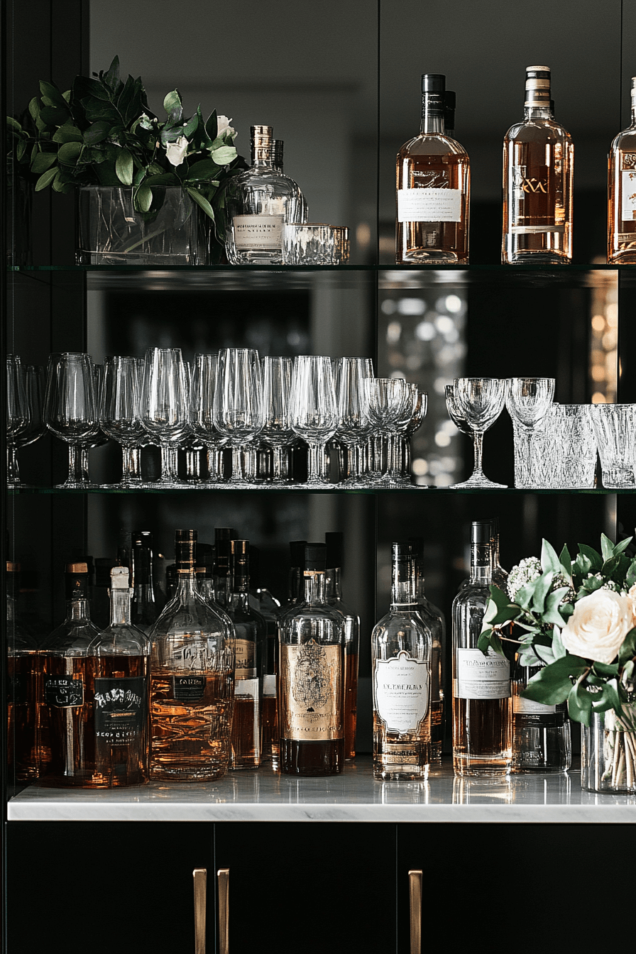 Transparent shelving keeps the setup light and modern, ideal for mini bar ideas small spaces design. Glass elements showcase bottles without visual heaviness. Soft lighting enhances clarity and elegance. The look feels open and refined. Perfect for contemporary homes.