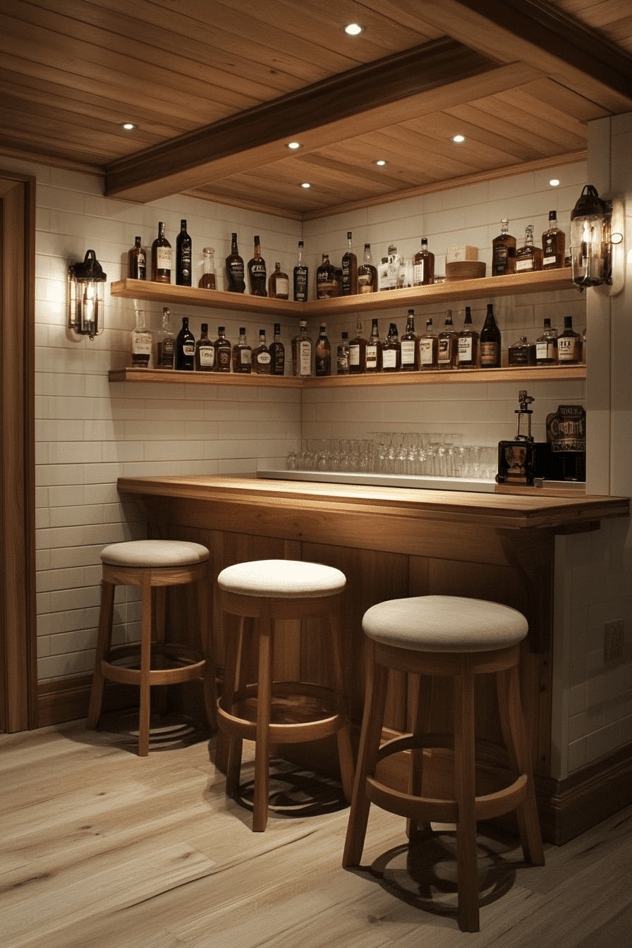 Transforming a quiet corner into a functional bar highlights the creativity behind mini bar ideas small spaces design. A small counter paired with tailored shelving brings purpose to unused areas. Thoughtful lighting adds atmosphere without visual clutter. The setup feels planned, not squeezed in. It’s subtle yet impactful.