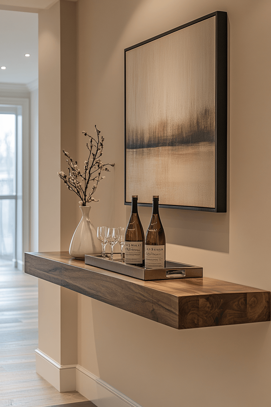 Small counters create intentional drink zones without dominating rooms, supporting mini bar ideas small spaces design. Narrow surfaces provide just enough prep area. Placement stays flexible. Modern materials keep it refined. Subtle yet effective.