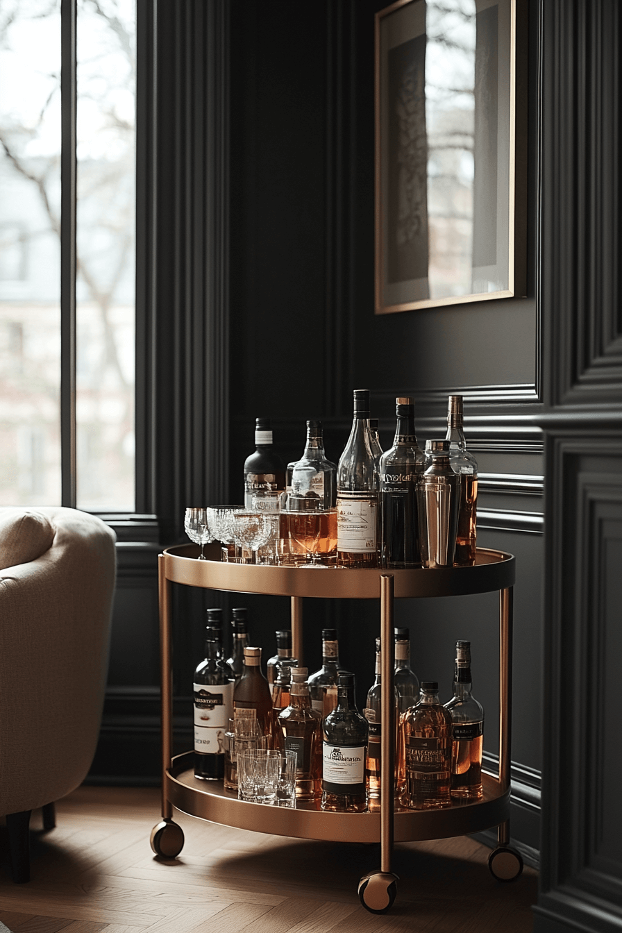 A movable drink station introduces flexibility into mini bar ideas small spaces design. Rolling carts adapt to different rooms and occasions. Tiered shelves keep everything in place. When entertaining ends, it stores away easily. Stylish and functional.