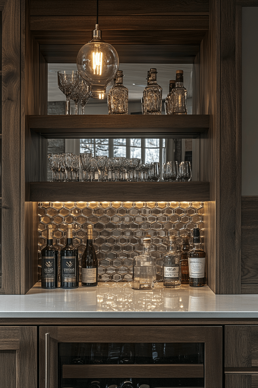 Reflective surfaces amplify light and depth, elevating mini bar ideas small spaces design instantly. Mirrored backdrops visually expand the area. Glassware and bottles feel more dramatic without added bulk. The effect is bright and sophisticated. Perfect for smaller rooms.