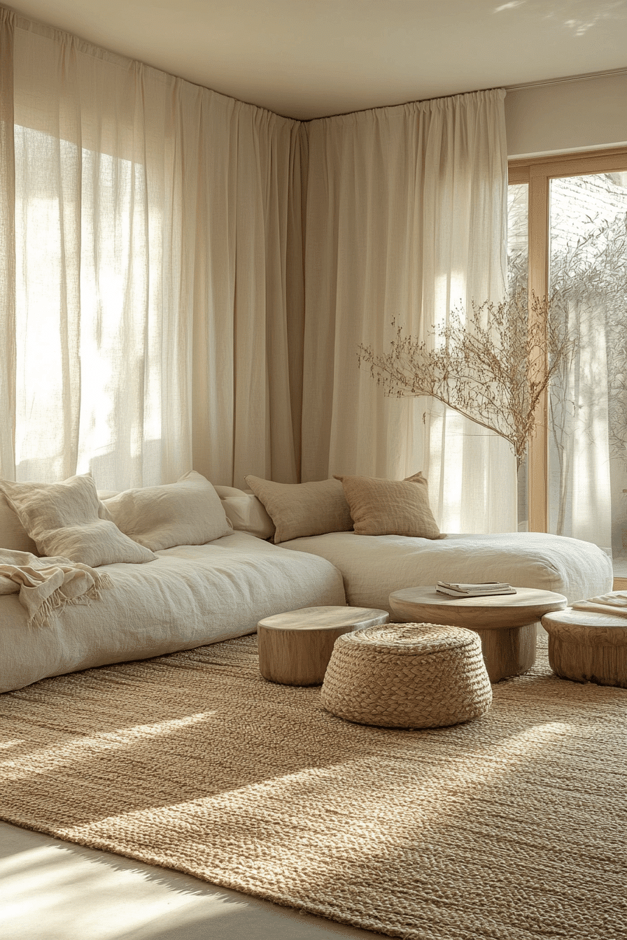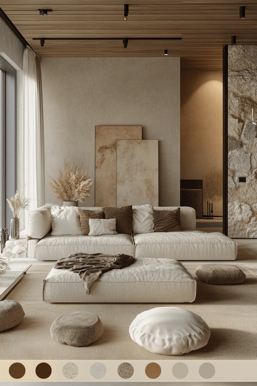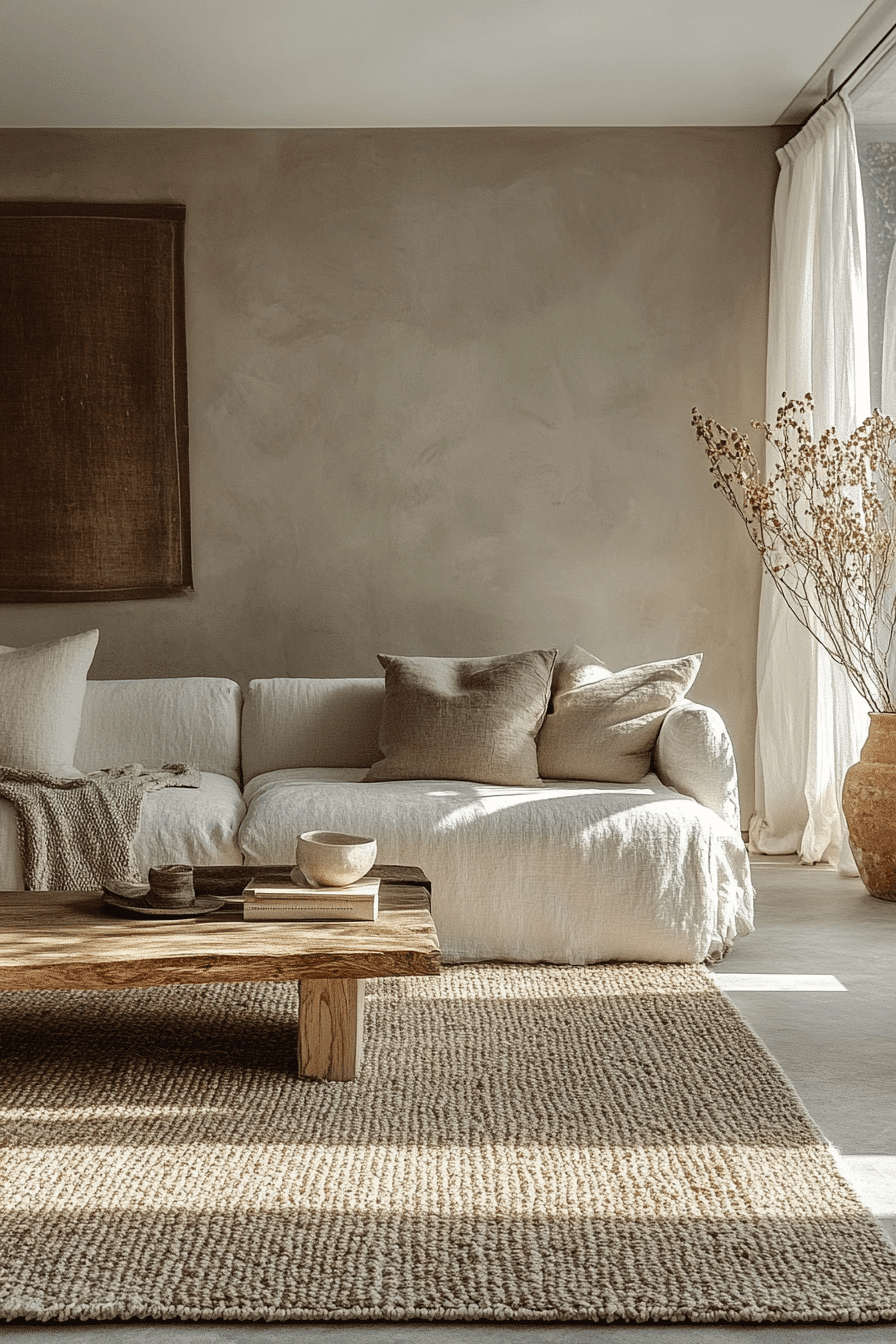 Cream and sand tones create a minimalist living room filled with natural warmth and softness. Layered neutrals build a cohesive palette. Clean furniture enhances the simplicity. This minimalist living room feels relaxed and harmonious. Natural light amplifies the warmth. Explore more cream and sand minimalist living room ideas.