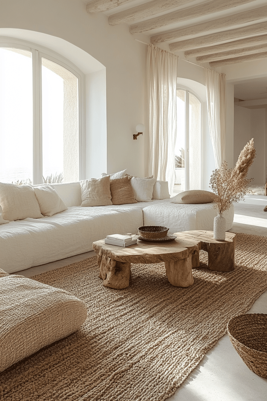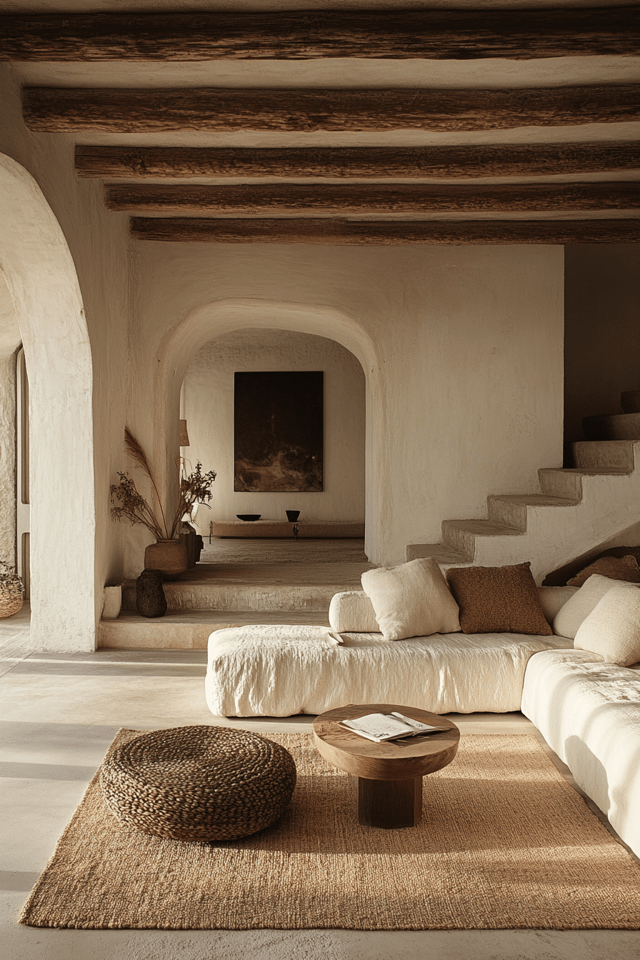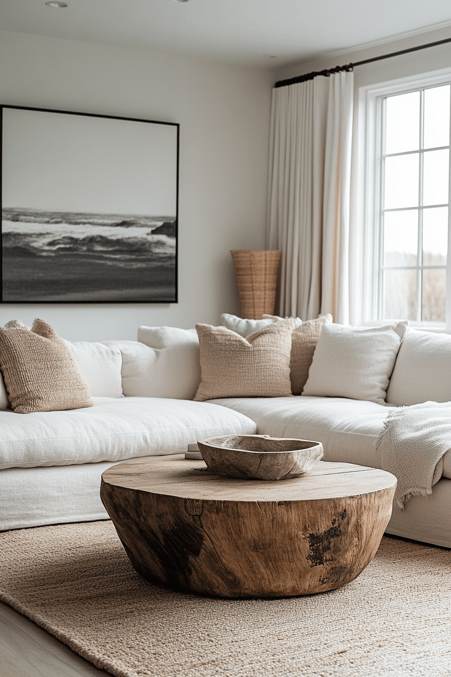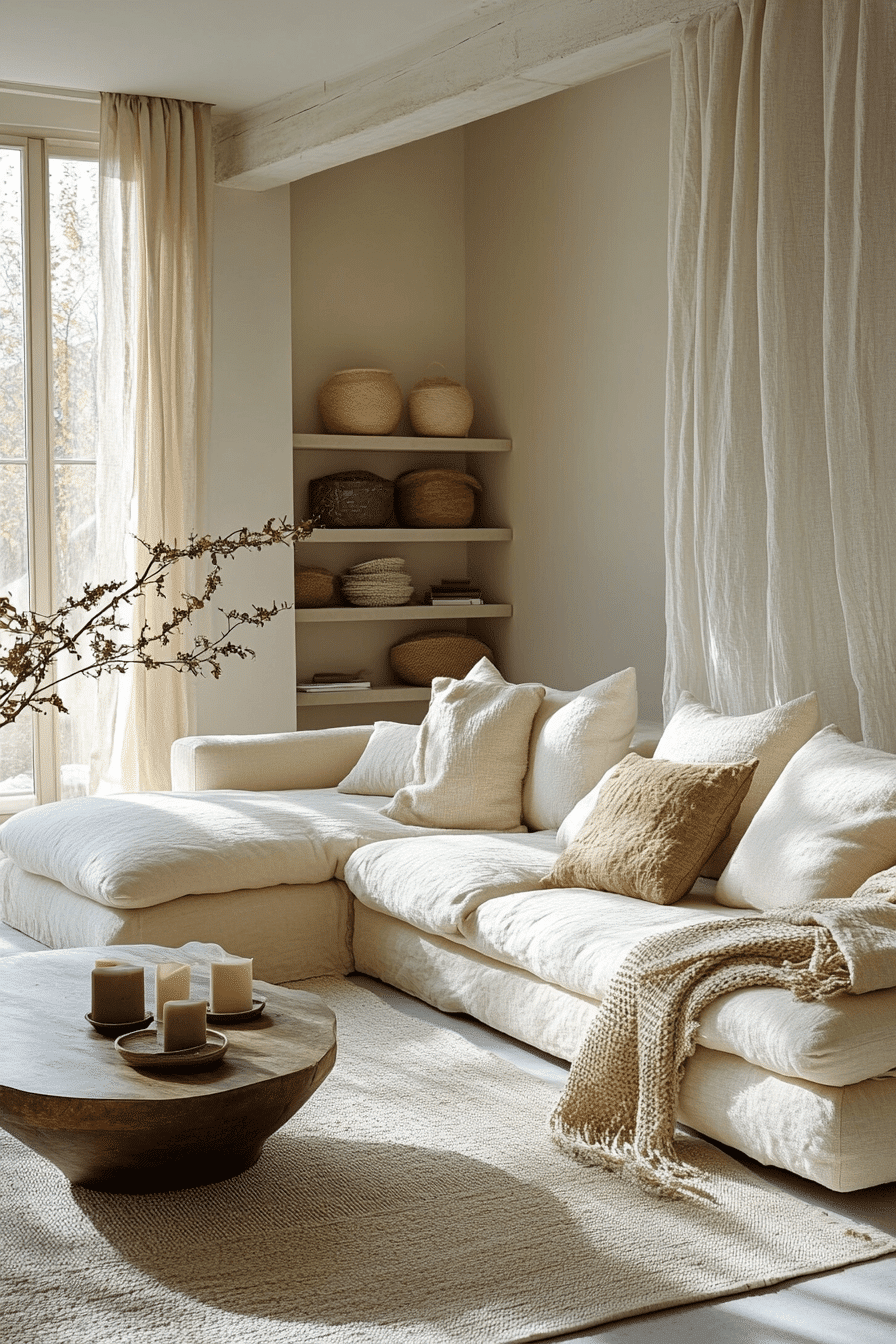 Cream and sand tones create a minimalist living room filled with natural warmth and softness. Layered neutrals build a cohesive palette. Clean furniture enhances the simplicity. This minimalist living room feels relaxed and harmonious. Natural light amplifies the warmth. Explore more cream and sand minimalist living room ideas.